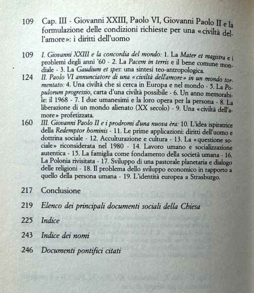 III. Giovanni Paolo II e i prodromi d'una nuova era: 10. L'idea ispiratrice della Redemptor Hominis 11. Le prime applicazioni: diritti dell'uomo e dottrina sociale - 12. Acculturazione e cultura 13. La «questione sociale» riconsiderata nel 1980 14. Lavoro umano e socializzazione autentica 15. La famiglia come fondamento della società umana - 16. La Polonia rivisitata - 17. Sviluppo di una pastorale planetaria e dialogo delle religioni - 18. Il problema dello sviluppo economico in rapporto a quello della persona umana 19. L'identità europea a Strasburgo.