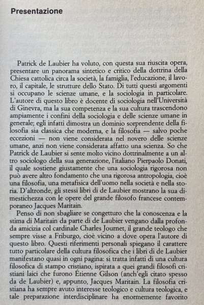 In particolare, l'opera dimostra in contrasto con coloro che negano l'esistenza di un pensiero sociale cristiano, tra cui "alcuni teologi troppo favorevoli ad una Chiesa disincarnata e assente dalle vicende della storia umana" non solo la possibilità, ma anche la realtà di una dottrina sociale della Chiesa. L'autore tratta il tema non soltanto da un punto di vista strettamente sociologico, ma anche valendosi della sua profonda conoscenza filosofica. Pertanto, ne viene fuori un panorama sintetico e critico della dottrina della Chiesa cattolica circa la società, la famiglia, l'educazione, il lavoro, il capitale, le strutture dello Stato.