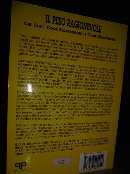 Riccardo, Dalle Grave. Verona, Positive Press, 1994. Il peso ragionevole. Che cos'é, Come raggiungerlo e Come Mantenerlo. In-8°, cart. edit. 240 pp. Come nuovo. Neg. mob. nero