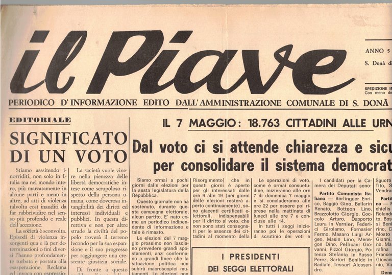 Il Piave, periodico d'informazione edito dall'amm. comunale di S. Donà di Piave. Anno 5° n° 8 22 apr. 1972.