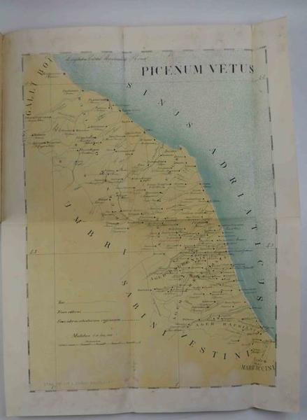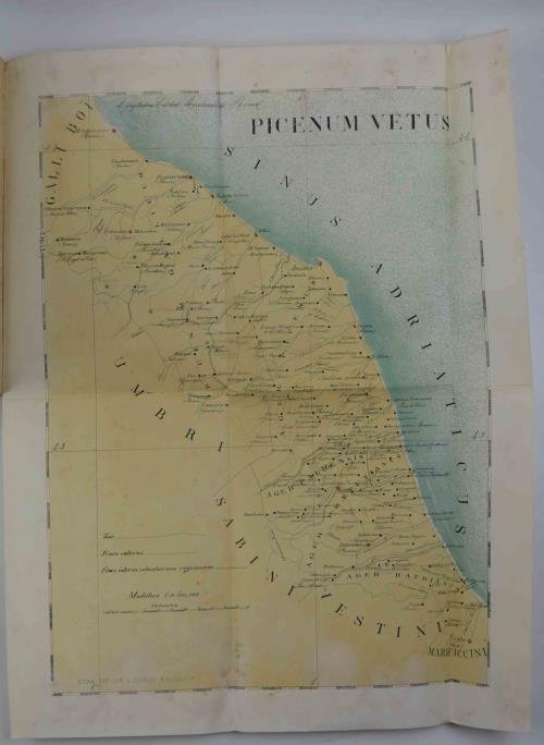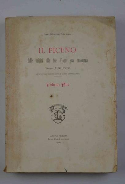 Due volumi in uno di cm. 25,5, pp. xi (1) 483; 291 (3). Con illustrazioni, tavole ed una grande carta corografica del territorio marchigiano di cm. 47 x 36 in litografia a colori ripiegata al fine. Brossura originale. Buona conservazione, a fogli chiusi. Edizione originale, non comune. Approfondito lavoro storico dello Speranza, il cui primo tomo è interamente dedicato alla storia dell'autonomo territorio marchigiano prima della sua incorporazione nell'Impero, basato sui più recenti studi di "paletnologia, etnica, linguistica, e archeologia", e corredato di una importante appendice bibliografica di oltre 50 pagine. Questo tomo, suddiviso in 3 Libri, tratta il periodo dalle origini all'invasione picena, dell'invasione picena sino al termine della prima Guerra Punica dopo la sottomissione a Roma, e della sottomissione del Piceno alla cittadinanza romana. Seguono un'appendice (pp. 443-483) sulle Antichissime iscrizioni picene corredata di XI tavole numerate I-XI, con commento e glossario. Il secondo tomo, suddiviso in 2 Libri, riguarda il "periodo dalla cittadinanza romana all'Impero" (ascesa di Pompeo, sue attività, operazioni militari, riforme, triumvirato, congiura, spedizione in Oriente, vittorie di Cesare assegnazioni ai veterani delle colonie picene, tumulti) e il "Piceno quinta regione d'Italia" (vicende sino al 2° Triumvirato, Guerra Partica, ultime guerre in cui si distinsero i Piceni, riforme, catasto, municipi, miglioramenti dei collegamenti stradali e abbellimenti sotto Augusto etc). Chiudono l'opera una dettagliatissima appendice bibliografica (pp. 218-268) ed un indice ragionato dei nomi e delle cose.