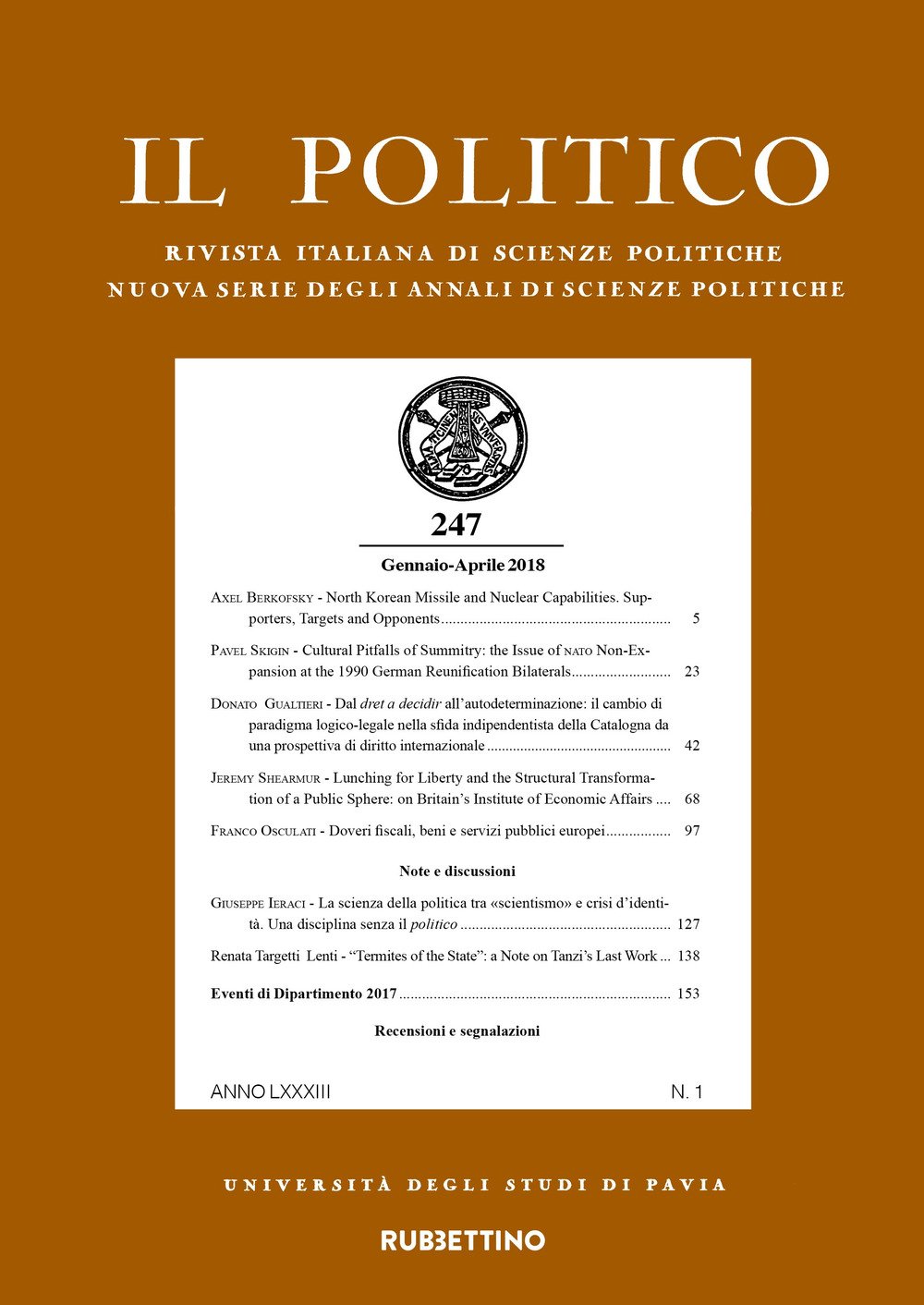 La rivista "Il Politico" si pubblica dal 1950 (fondatore Bruno Leoni) quale continuazione degli "Annali di Scienze Politiche" fondati nel 1928. Ogni fascicolo, di circa 180 pagine, contiene articoli, note e rassegne di scienza politica, di diritto, di politica economica, di sociologia, di storia e di politica internazionale. Alla rivista si affianca la collana dei "Quaderni della rivista Il Politico". Vi collaborano, oltre ai docenti dell'Università di Pavia, studiosi delle principali università italiane e straniere.