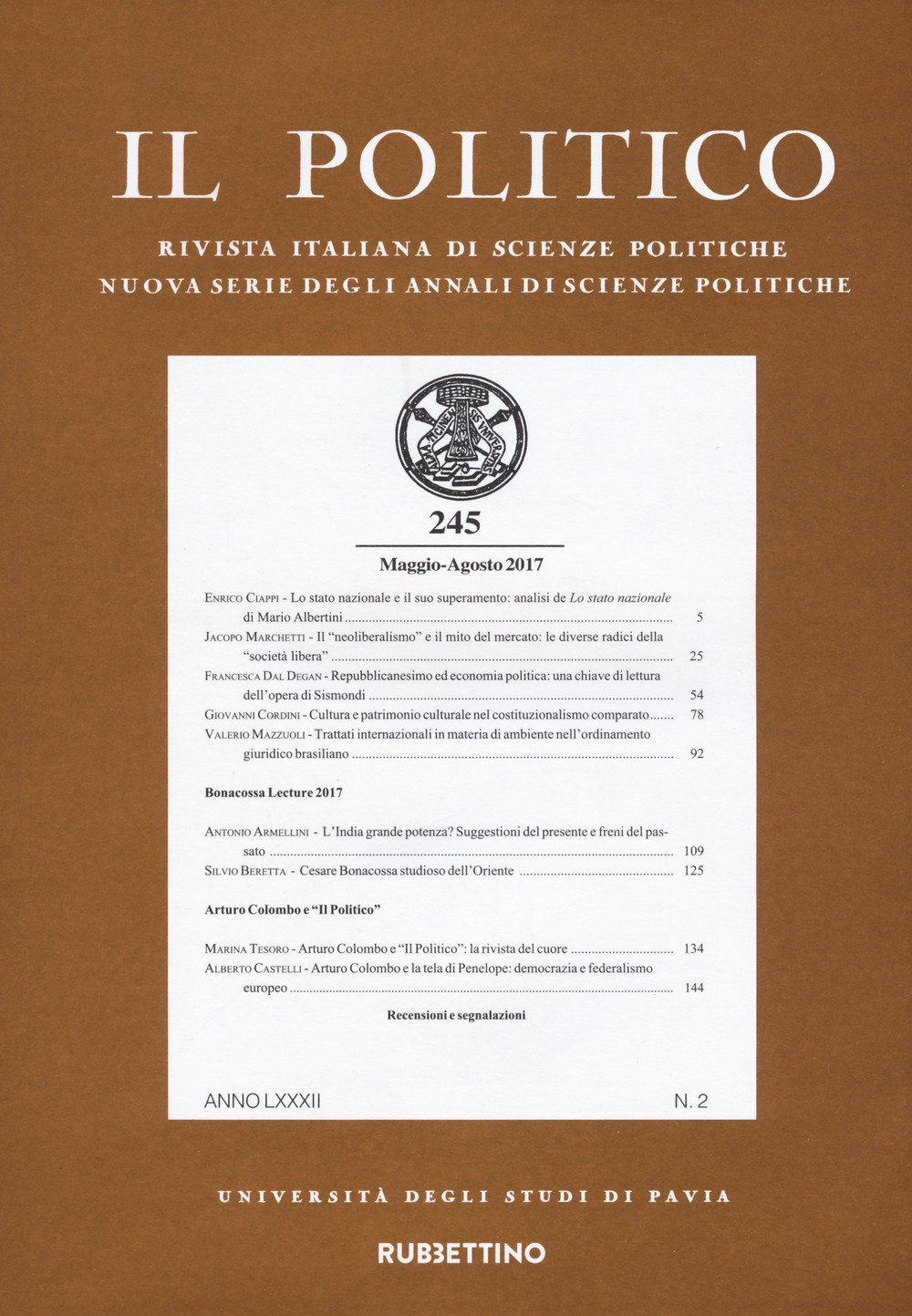 La rivista "Il Politico" si pubblica dal 1950 (fondatore Bruno Leoni) quale continuazione degli "Annali di Scienze Politiche" fondati nel 1928. Ogni fascicolo, di circa 180 pagine, contiene articoli, note e rassegne di scienza politica, di diritto, di politica economica, di sociologia, di storia e di politica internazionale. Alla rivista si affianca la collana dei "Quaderni della rivista Il Politico". Vi collaborano, oltre ai docenti dell'Università di Pavia, studiosi delle principali università italiane e straniere.