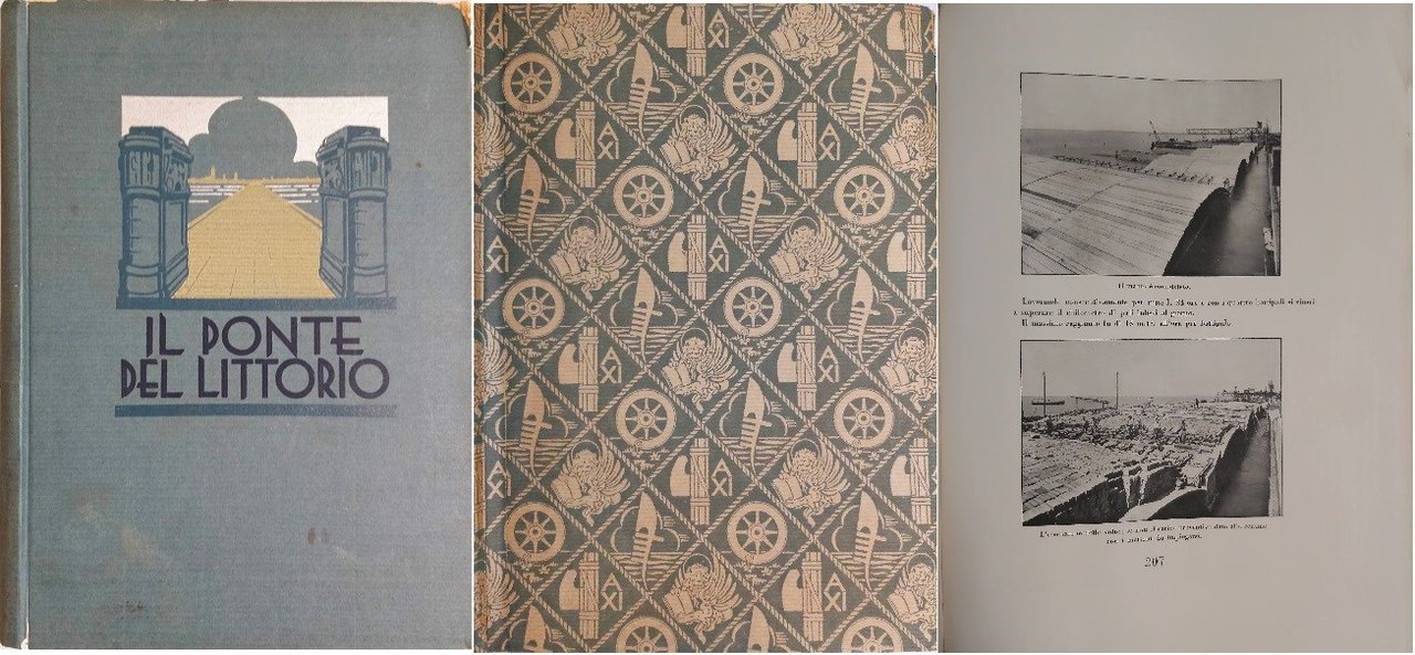 gr. vol. in folio, pp. 274, (8), 22, bella leg. t. tela edit. con cop. ant. figurata firmata da Gorgon Tanozzi. Risguardi in carta dec. con i simboli di Venezia e del fascio littorio. Con numerose ill. fotografiche n.t., 22 tavv. ripiegate al fine con i progetti, prospetti e sezioni dell'Ing. Eugenio Miozzi, 11 tavv. f.t. su cartoncino in seppia con disegni di Cesare Mainella, e 3 tavv. ripiegate a colori. Prefazione del Podestà di Venezia Mario Alverà. Poderosa e rara opera pubblicata solo un anno dopo l'inaugurazione del Ponte del Littorio (ora Ponte della Libertà), ponte stradale che congiunge la terraferma e Venezia, inaugurato il 25 aprile 1933 per la festa di San Marco e i cui lavori iniziarono solo due anni prima nel luglio del 1931. La prima parte riguarda la progettazione: un pò di storia, studi, proposte e opposizioni, la ferrovia, il sottosuolo, progetti precedenti e quello approvato. La seconda parte riguarda l'esecuzione dei lavori: da Mestre alla laguna, dalla terraferma al margine di Venezia fino a piazzale Roma, e il Rio Novo. Qualche minima mancanza agli angoli e al d. Ottimo esempl. e molto raro. [207]