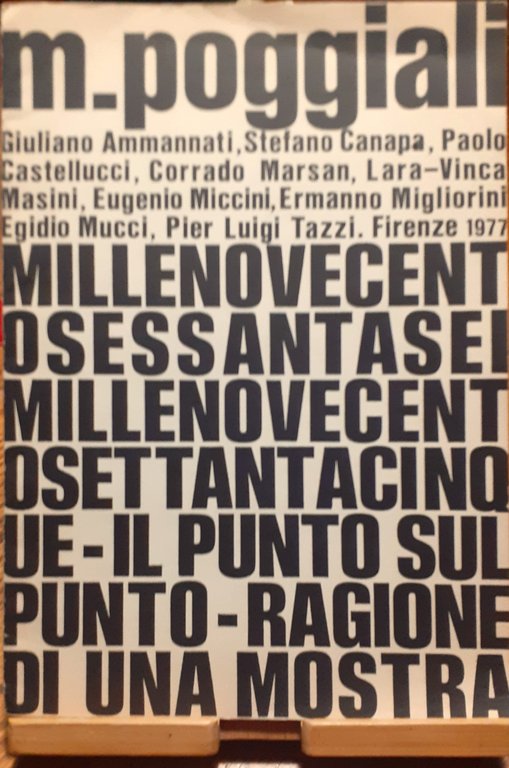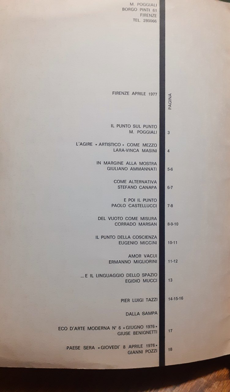 Indice: Il punto sul punto, M. Poggiali (marzo 1976) - L'agire artistico" come mezzo, Lara-Vinca Masini - In margine alla mostra, Giuliano Ammannati - Come alternativa, Stefano Canapa - ..E poi il il punto, Paolo Castellucci - Del vuoto come misura, Corrado Marsan - Il punto della coscienza, Eugenio Miccini - Amor vacui, Ermanno Migliorini - .E il linguaggio dello spazio, Egidio Mucci - Pier Luigi Tazzi, Three Stories - Dalla stampa (da "Eco d'arte moderna" n. 6 del giugno 1976, articolo di Giuse Benignetti - da "Paese Sera - Il Nuovo Corriere" di giovedì 8 aprile 1976, articolo di Gianni Pozzi. In-4, pp. 18 comprese la 2^ e la 3^ di copertina, bross. con due punti metallici con grafica in b/n. Con illustrazioni in b/n. Stato buono (leggero stato d'usura della copertgina ai margini)"