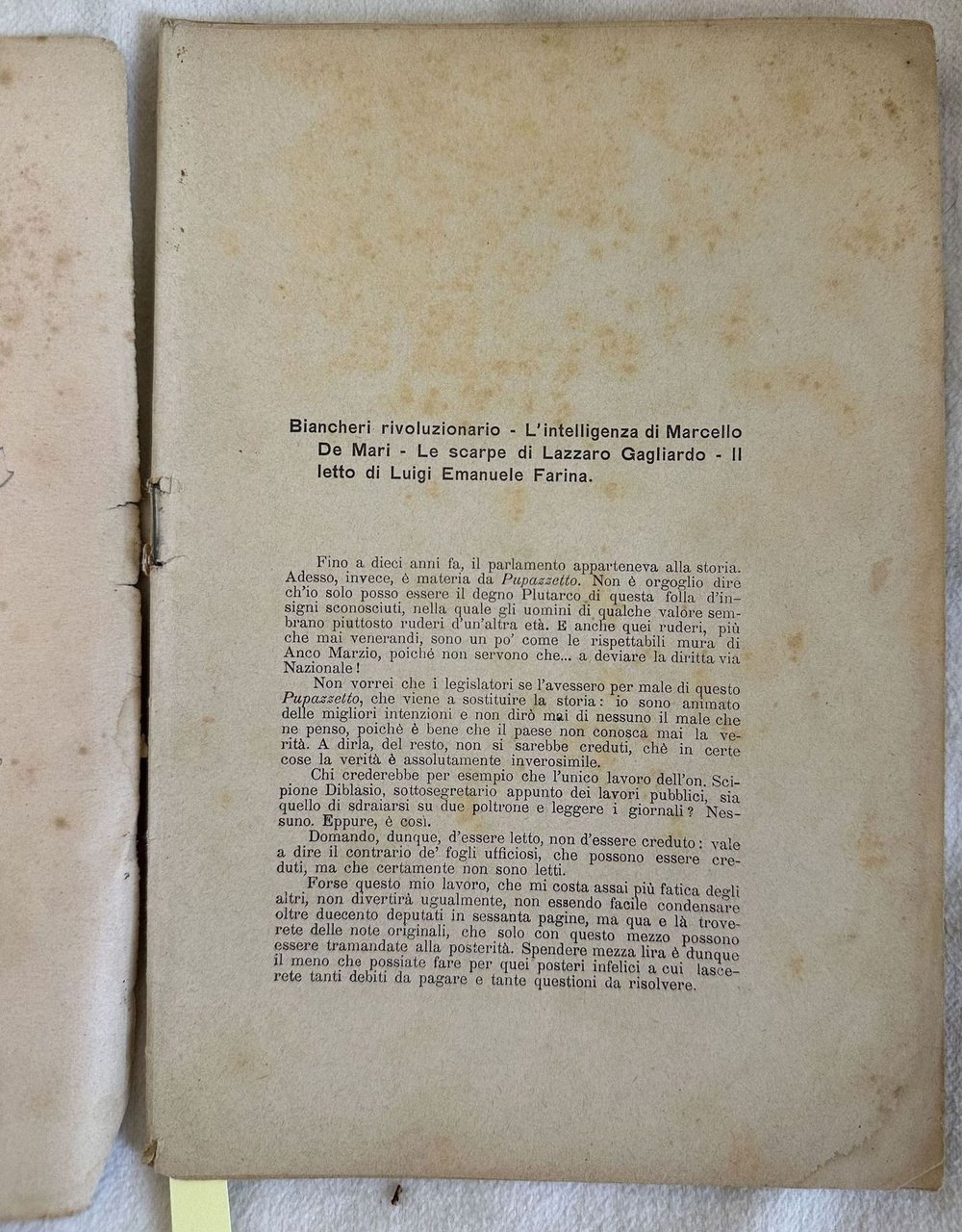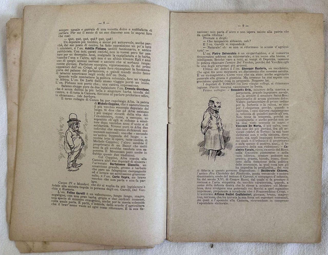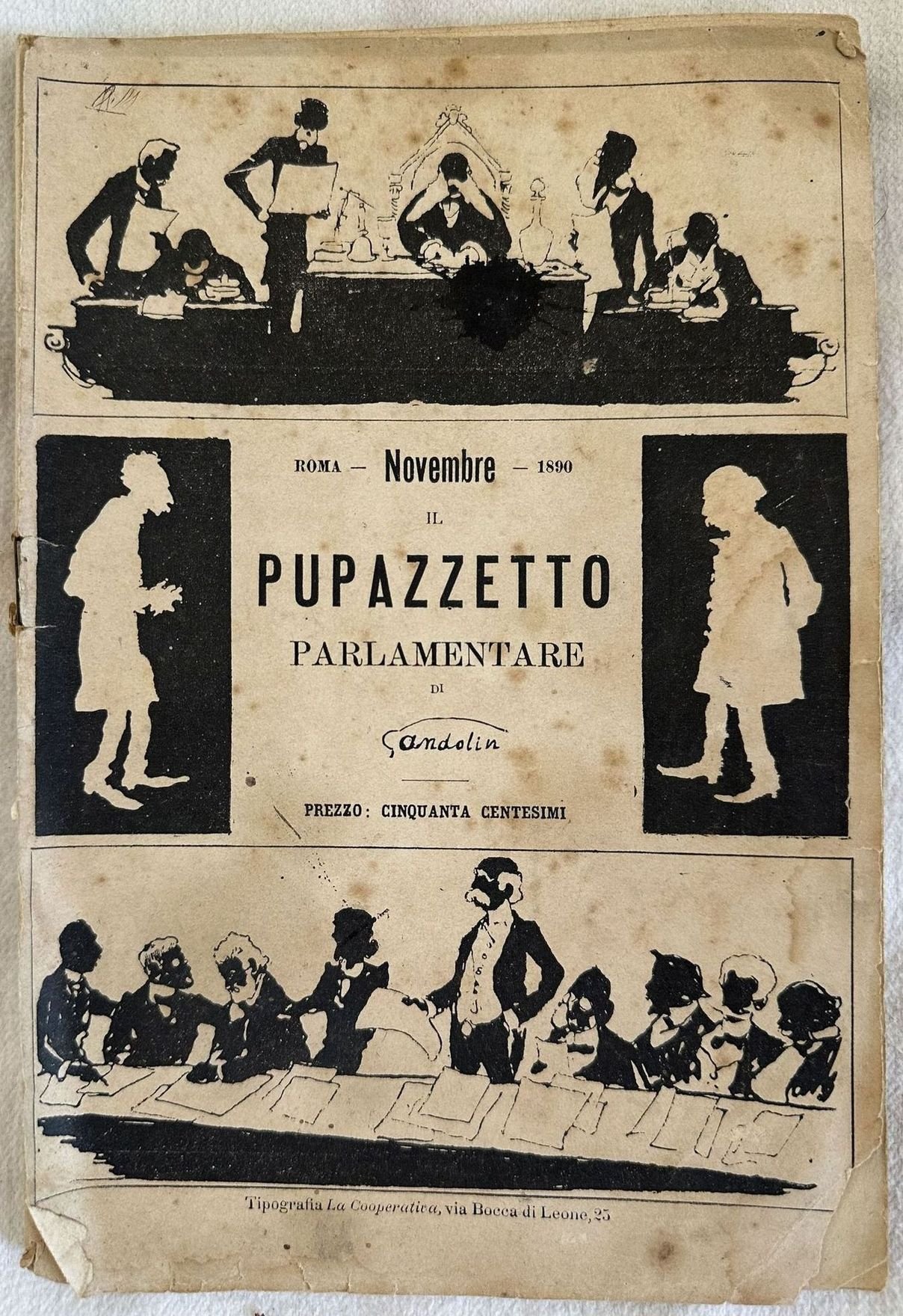 Numero del novembre 1890 della rivista "Pupazzetto parlamentare" realizzata dal giornalista genovese Gandolin pseudonimo di Luigi Arnaldo Vassallo e regalata agli abbonati de "Il Capitan Fracassa". All'interno numerose illustrazioni che ritraggono parlamentari (Albini, Farina, Giolitti, Roux, Galimberti, Coppino, Plebano, Gianolio, Garelli, Basteris, Delvecchio, Chiaves, Berti, Campans, Chiala, De Rolland, Ercole, Villa, Oddone, Ferraris, Borgatta, Trompeo, Curioni, Maurogonato, Maldini, Mattei, Gabelli, Doda, Mej ecc. In mediocri condizioni. Copertina editoriale in mediocri condizioni con usure ai margini e dorso. Piatto anteriore staccato e posteriore assente. Legatura quasi assente. Pagine in buone condizioni con fioriture. In 8. cm. 23x15,5. pp. 64. Number of november 1890 of the magazine "Pupazzetto parlamentare" realized by the journalist from Genoa Gandolin pseudonymous ofi Luigi Arnaldo Vassallo gift toreaders of "Il Capitan Fracassa". inside different illustrations featuring people from Parliament (Albini, Farina, Giolitti, Roux, Galimberti, Coppino, Plebano, Gianolio, Garelli, Basteris, Delvecchio, Chiaves, Berti, Campans, Chiala, De Rolland, Ercole, Villa, Oddone, Ferraris, Borgatta, Trompeo, Curioni, Maurogonato, Maldini, Mattei, Gabelli, Doda, Mej ecc. In poor conditions. Editorial cover in poor conditions lightly worn in the extremities. Front plate is detached and back plate is missing. Binding almost lacks. Pages are in good conditions with foxing. In 8. cm. 23x15,5. pp. 64.