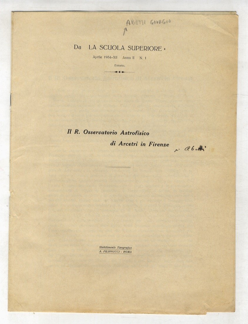Roma, Stabilimento Tipograifco A. Filippucci, [c. 1934], in-8 grande, nato senza brossura, pp. [12]. Con illustrazioni n.t. Estratto da "La Scuola Superiore", aprile 1934.
