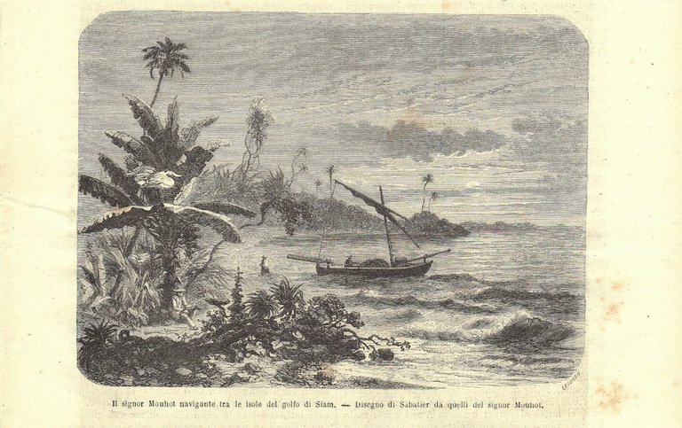 Il sig. Mouhot navigante tra le isole del golfo del Siam. Stampa 1863.