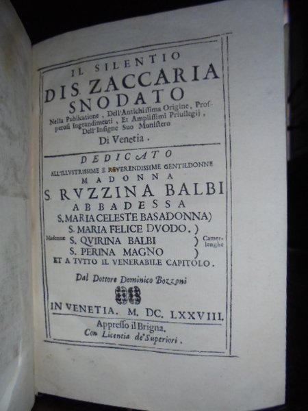 IL SILENTIO DI S.ZACCARIA SNODATO NELLA PUBLICATIONE DELL' ANTICHISSIMA ORIGINE, PROSPEROSI INGRANDIMENTI ET AMPLISSIMI PRIVILEGI DELL' INSIGNE SUO MONASTERO DI VENETIA. VENETIA, APPRESSO IL BRIGNA. 1678 1678
