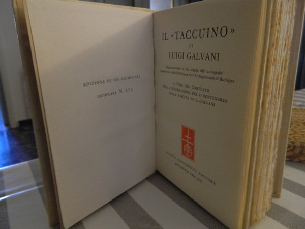 IL TACCUINO DI LUIGI GALVANI. RIPRODUZIONE FAC-SIMILE DELL'AUTOGRAFO CONSERVATO NELLA BIBLIOTECA DELL'ARCHIGINNASIO DI BOLOGNA. A CURA DEL COMITATO PER LA CELEBRAZIONE DEL II CENTENARIO DELLA NASCITA DI L. GALVANI.