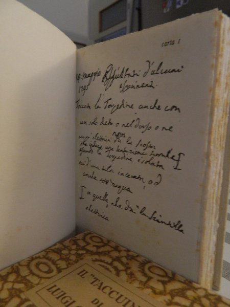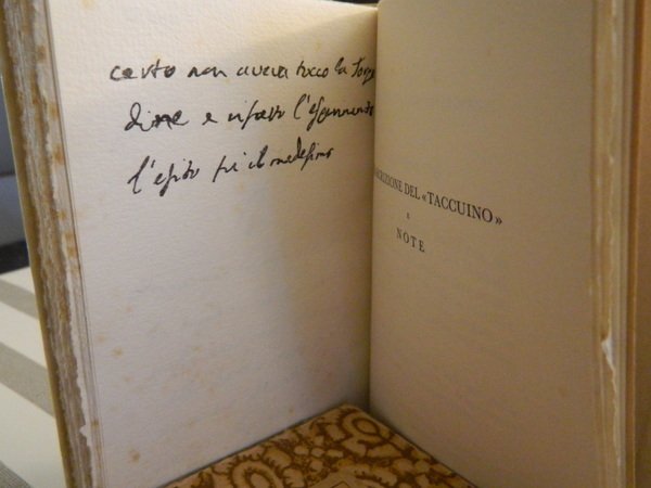 Il <<TACCUINO>> di LUIGI GALVANI. A cura del Comitato per la celebrazione del II centenario della nascita di L. Galvani. Bologna, Zanichelli Editore, 1937. Riproduzione in fac-simile dell' autografo conservato nella Biblioteca dell' Archiginnasio di Bologna. In-16°, pergamena edit. muta. xxv, 68 carte (=136 pp.), 41 pp. Esemplare in ottimo stato di conservazione con barbe nell' astuccio originale. Edizione di 500 esemplari (n° 472). Casa.