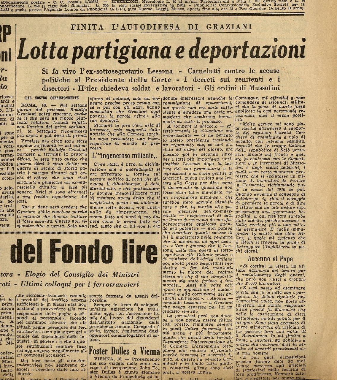Milano, [s.n.], 1948, fascicoli 11, in-folio, in forma di giornale quotidiano, pp. 4 a fascicolo. In tutti gli 11 fascicoli parte della prima pagina è dedicata al processo al maresciallo Graziani, relativamente al ruolo da lui svolto nella Repubblica Sociale Italiana.