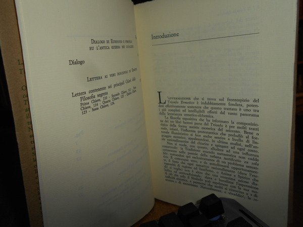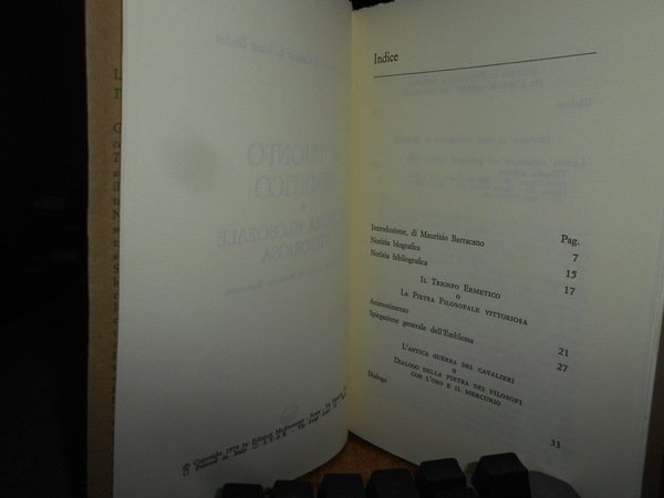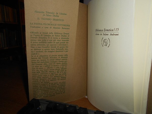 LIMOJON de Sainct Disdier. Roma, Edizioni Mediterranee, 1974. Il Trionfo Ermetico. La Pietra Filosofale Vittoriosa. Traduzione a cura di Maurizio Barracano. In-8°. cartoncino edit. con risvolti. 126 pp. Come nuovo. Uff. stanzetta mob. a sinistra finestra