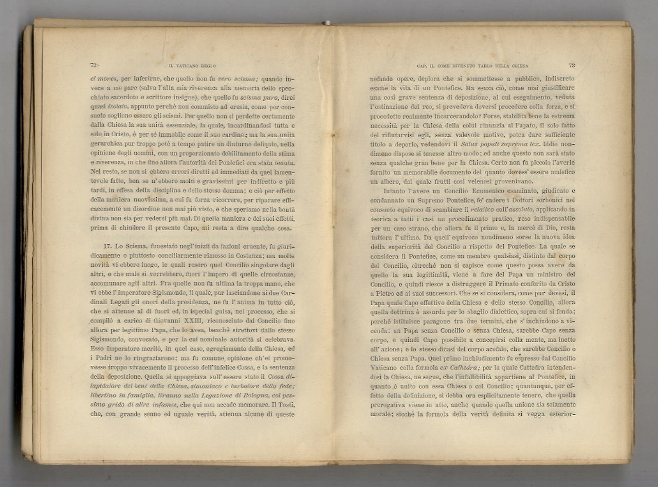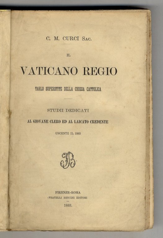 Firenze-Roma, Fratelli Bencini, 1883, in-8, br. editoriale gialla con copertina anteriore e dorso fittizi, pp. XXVIII, 338,(2). Blande tracce di polvere alle prime carte ma ottimo esemplare, intonso. Il gesuita Curci, prima schierato a favore del potere temporale della Chiesa, evolverà verso posizioni di critica (in specie del Vaticano, in quanto corte papale), vedendo nell'accordo col nuovo Regno d'Italia la possibilità d'una necessaria riforma ecclesiastica, pel "correggimento di abusi e rilevamento da bassezze (che è) sommo bisogno odierno della Chiesa Cattolica"; espulso dall'Ordine, poi sospeso "a divinis", ritrattò nel 1884.