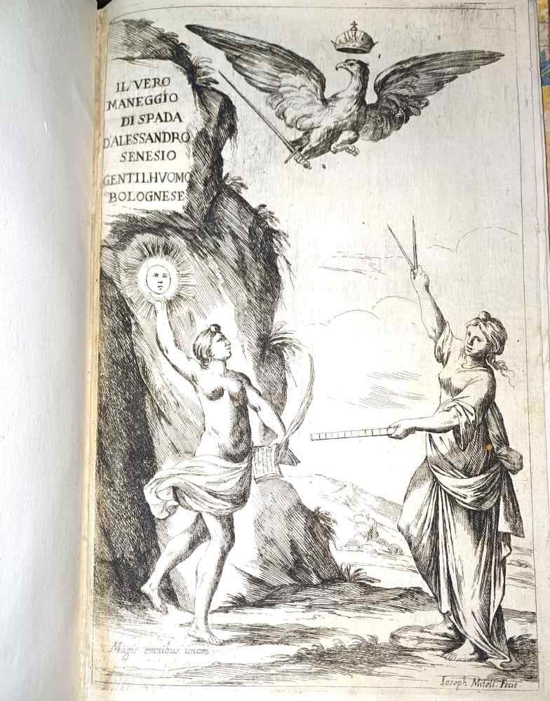 <p>31 cm, In folio, rilegatura coeva, solida rilegatura in cartone alla rustica ricoperto da carta marmorizzata con nervi esposti ai piatti, p. (16), 70, (2). Ricco antiporta allegorico e 14 belle tavole fuori testo incise da Giuseppe maria Mitelli che riproducono diverse pose degli schermidori. Introduzione con dedicatoria e ode all'Arciduca d'Austria Carlo Ferdinando seguito da alcuni scritti sulla scherma, in fine al volume, trattato latino di scherma "De regulis necessariis atque infallibilibus in legitima Ensis tractatione" con l'illustrazione di uno schema geometrico nel testo. Esemplare ottimo, marginoso e genuino, molto bello.</p>