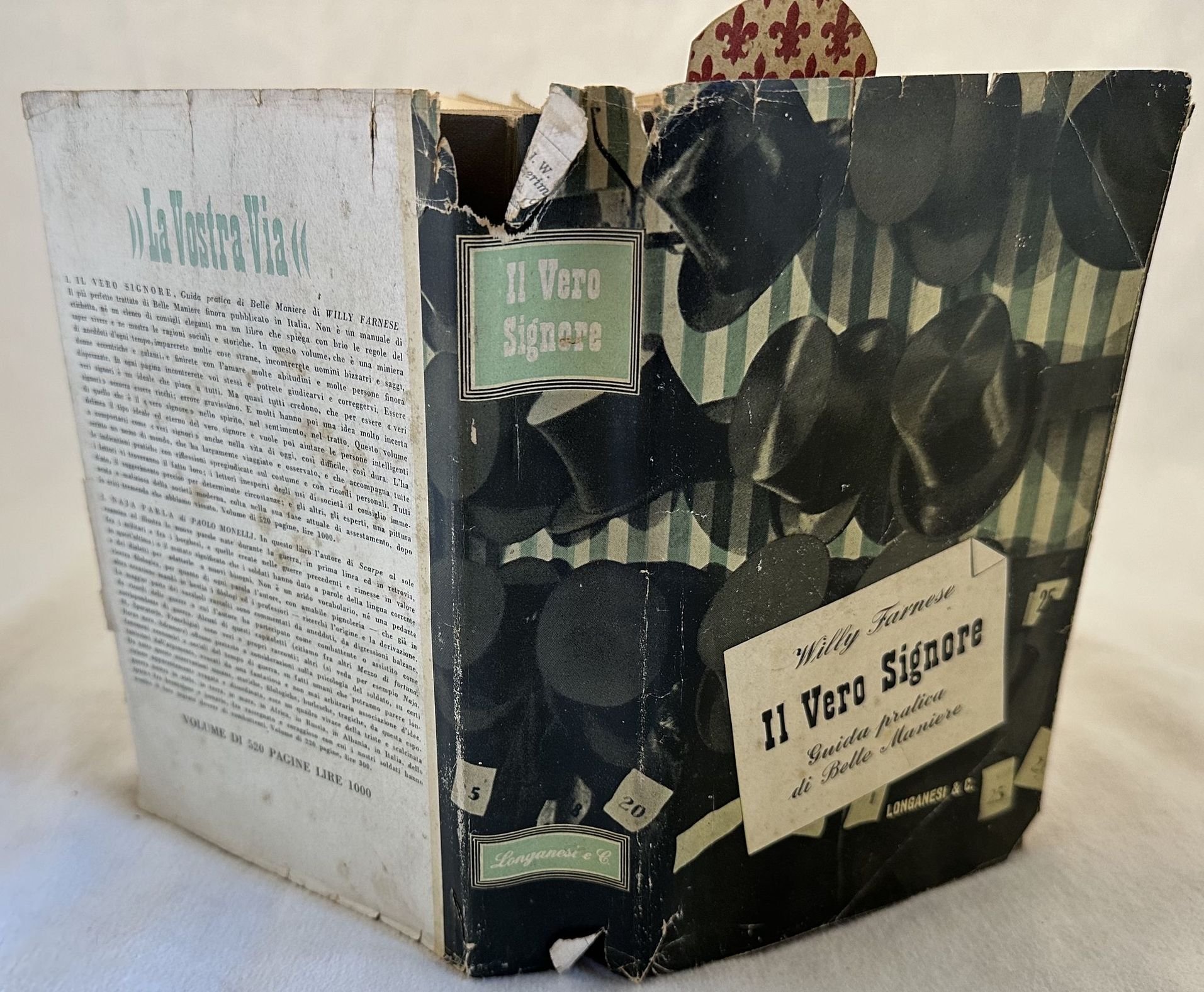 Prima edizione del 1947 di questa feroce guida alle belle maniere scritta da Willy Farnese pseudonimo del giornalista Giovanni Ansaldo (1895-1969). Il volume, prima opera da scrittore dell'autore, è un galateo che si discosta dai classici Della Casa, Gioia e Marchesa Colombi. All'interno: Con la moglie, con i figli, come abita, come veste, coem si comporta in pubblico, negli incontri quotidiani, come scrive, negli affari e nella professione, in visita e in conversazione, nei divertimenti negli sports, a tavola, in viaggio, nella vita politica, in vecchiaia e sul letto di morte ec. In discrete condizioni. Copertina editoriale in discrete condizioni con lievi usure ai margini e dorso. Sovraccoperta con usure e mancanze. Legatura in buone condizioni. All'interno le pagine si presentano in discrete condizioni con fioriture. Ultima pagina in parte staccata. In 16. Dim. 18,5x12 cm. Pp. 511+(1).First edition of 1947 of this hard guide to good manners written by Willy Farnese pseudonymous of the journalist Giovanni Ansaldo (1895-1969). The volume, first work of the author as a writer, is a good manners guide that is different from classical Della Casa, Gioia and Marchesa Colombi. Inside: Con la moglie, con i figli, come abita, come veste, coem si comporta in pubblico, negli incontri quotidiani, come scrive, negli affari e nella professione, in visita e in conversazione, nei divertimenti negli sports, a tavola, in viaggio, nella vita politica, in vecchiaia e sul letto di morte ec. In fair conditions. Editorial cover in fair conditions lightly worn in the extremities. Dustjacket with wearings and lackings. Binding in good conditions. Inside pages are in fair conditions with foxing. Last page partially detached. In 16. Dim. 18,5x12 cm. Pp. 511+(1).<BR><BR>