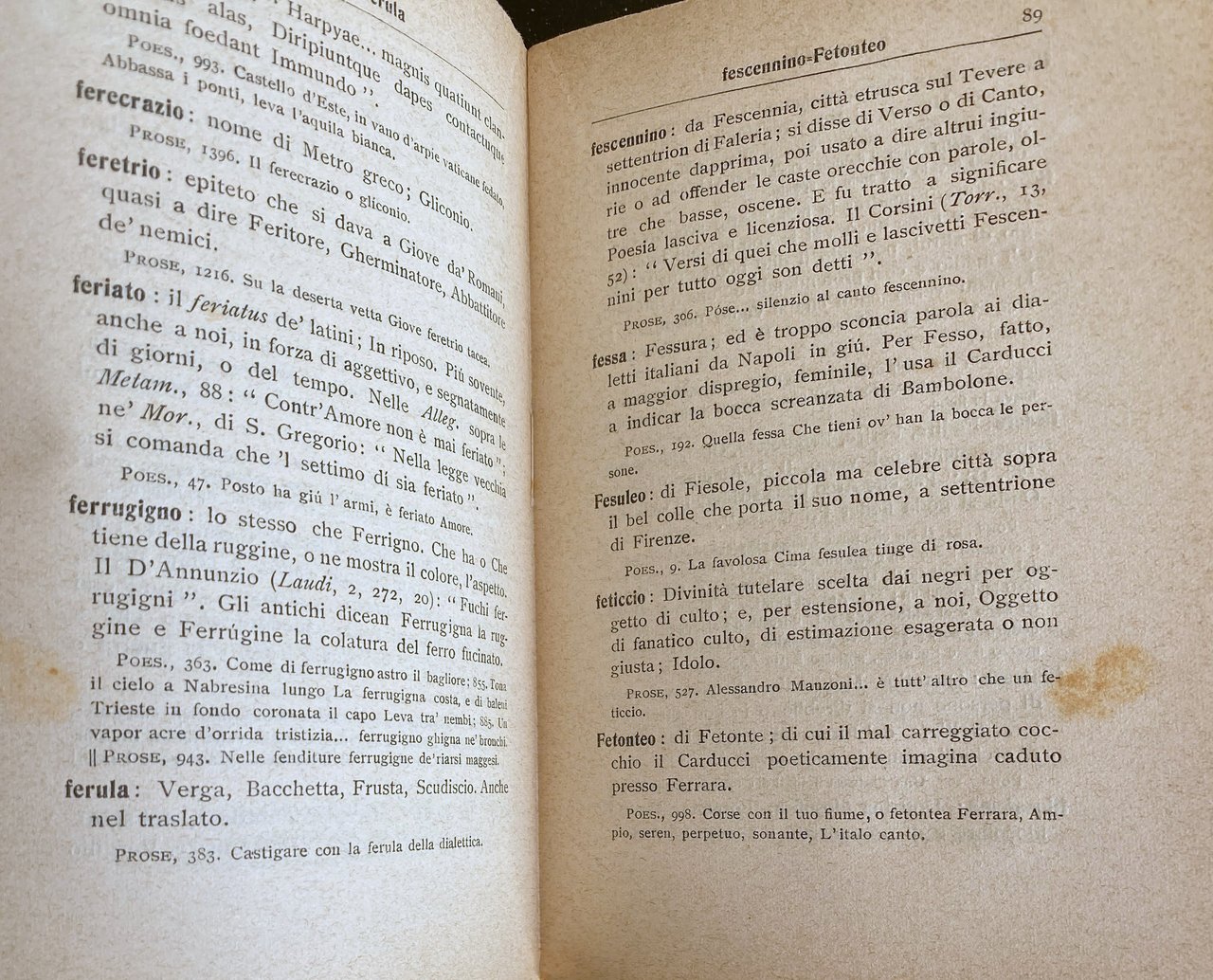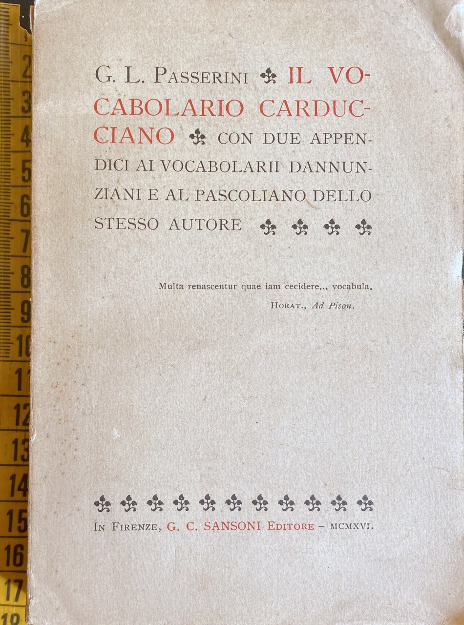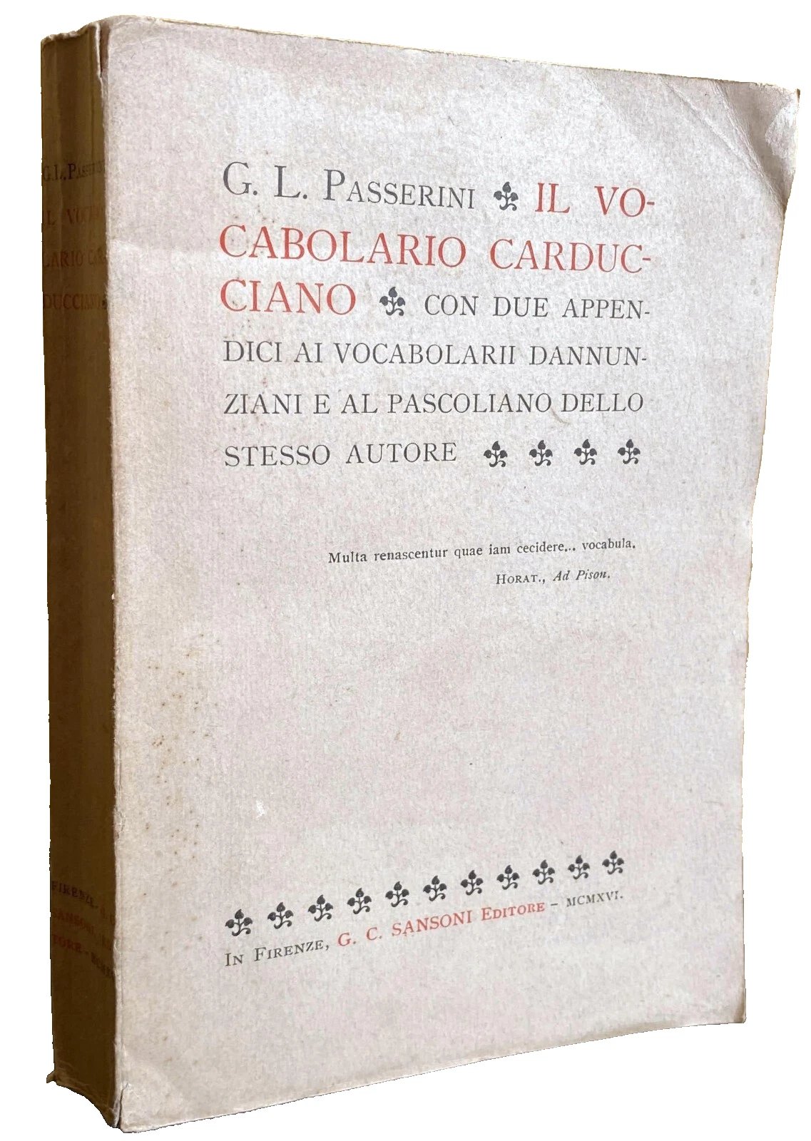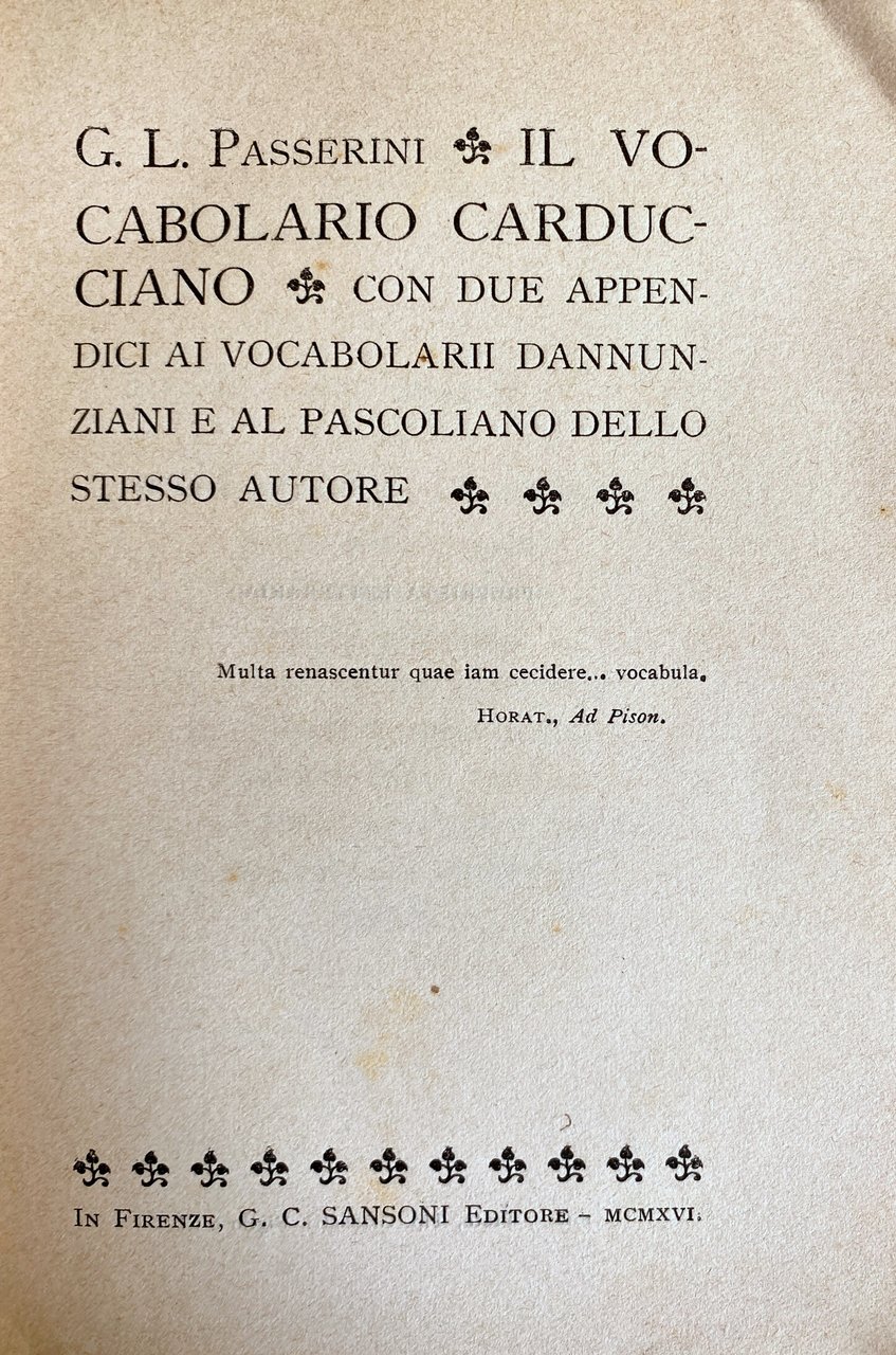 - Letteratura italiana, Collezionismo, Dizionari letterari, Dizionari Critici, Dizionari Ragionati, Prosa, Poesia, Critica letteraria, Gabriele D'Annunzio, Giosuè Carducci, Giovanni Pascoli, Termini, Nomi, Parnaso, Lettere, Opere generali, Mitologia, Latinismi, Latino, Elegie, Commentari, Poemetti, Pensieri, Discorsi, Italianistica, Rarità, Libri antichi, Libri fuori catalogo, Studi culturali, Saggi, Repertori, Terminologia, Elenchi, Definizioni, Odi, Poetica, Distici elegiaci, Rime, Prose, Poesie, Antologie, Da collezione, Novecento, Dizionarietto, Vocabolari, Dizionari
