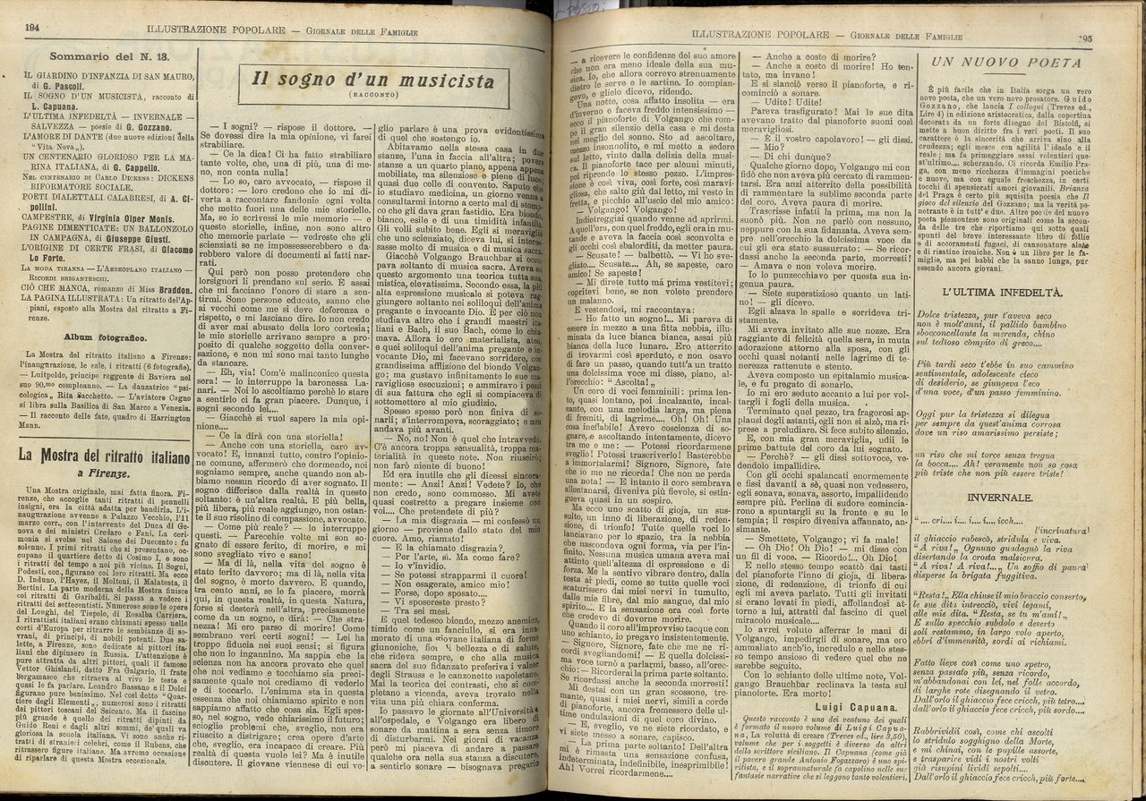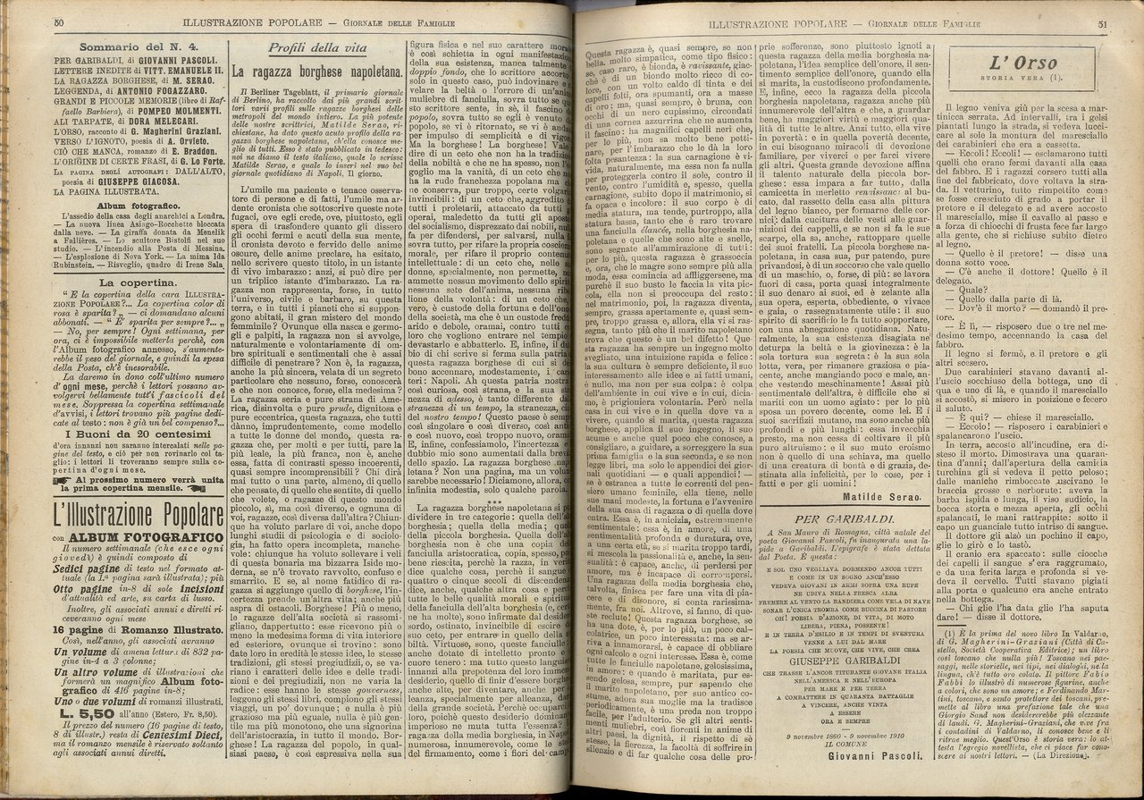 Illustrazione Popolare. Giornale per le famiglie. Con album fotografico. Gerente: E. Brunetti. Anno 42° - Vol. XLVIII°: NN. 1-48. (Segnaliamo anteprima dei racconti "Presentimento" e "Il sogno d'un musicista" di L. Capuana apparsi poi nella raccolta "La voluttà di creare" presso Treves; di G. Pascoli: epigrafe per la lapide a Garibaldi in San Mauro di Romagna il 9.11.1910 e prefazione all'opuscolo a profitto del Giardino d'Infanzia; "Inno degli emigrati italiani a Dante", composto per l'inaugurazione del monumento a Dante realizzato da E. Ximenes a New York e voluto dalla comunità italiana: doveva essere musicato da Leoncavallo; "Italia!": discorso pronunciato nella Accademia navale di Livorno; estratti da: "Nel Cinquantenario della Patria"