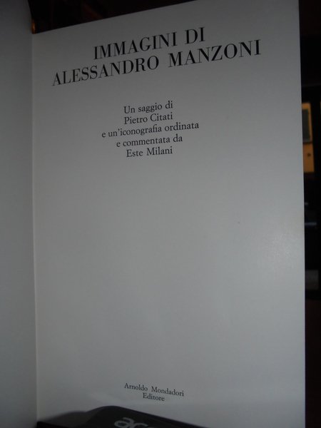 Immagini di Alessandro Manzoni. Un saggio di Pietro Citati e un' iconografia ordinata e commentata da Este Milani. Milano, A. Mondadori, 1973. In-8°, similpelle edit. con astuccio in cartoncino illustrato a colori. XLIX, 286 pp. con numerose illustrazioni in bianco e nero n.t. In ottimo stato di conservazione. Neg. mob. nero carc.