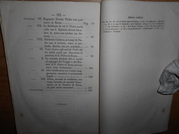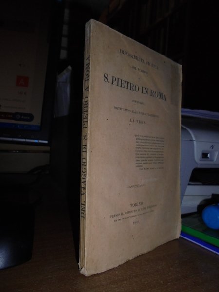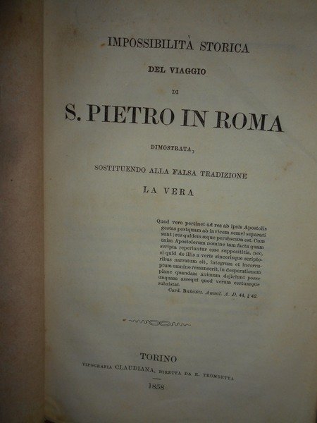 Anonimo. Torino, presso Il Deposito di Libri Religiosi (Tipografia Claudiana), 1858. Impossibilità storica del viaggio di S. Pietro in Roma dimostrata sostituendo alla falsa tradizione la vera. In-16°, br. orig. 162 pp. Opuscolo molto ben conservato. Neg. scat. 2 opusc. nonn.