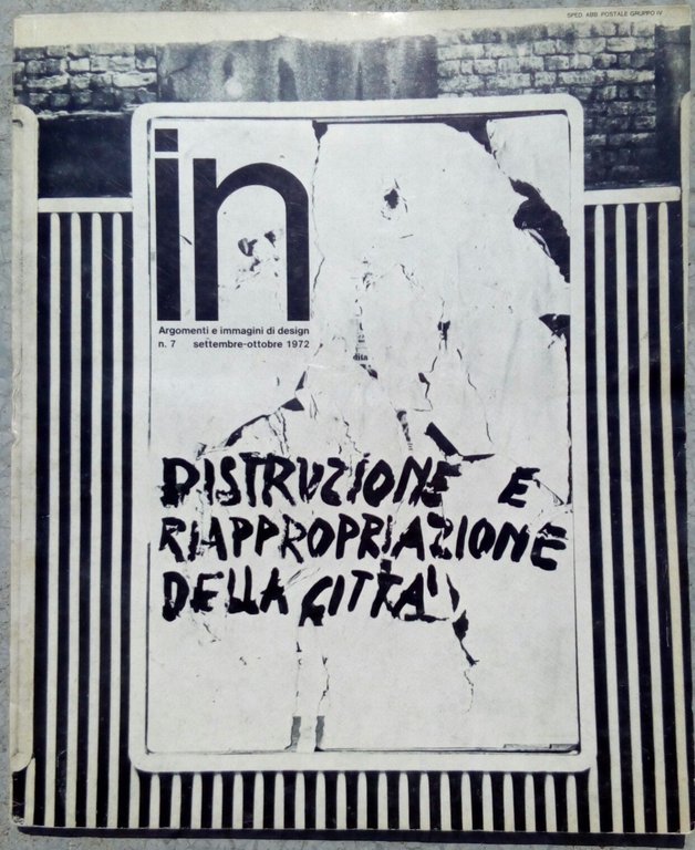 inArgomenti e immagini di designn^ 7 settembre - ottobre 1972DISTRUZIONE E RIAPPROPRIAZIONE DELLA CITTA'Redazione . Direttore Pierpaolo Saporito Redattore Capo Ugo La PietraEditoriali di. Cesare Blasi Gabriella Padovano - Jorg Mayr - Gianni Emilio Simonetti - Archigram Group - Archizoom Associati - Charles Jencks - Ernesto L. Francalanci - Superstudio - Riccardo Dalisi - Leon Von SchaikPrima e quarta di copertina Ugo La Pietrapagine 94in buono stato(280 g)E 21288/8