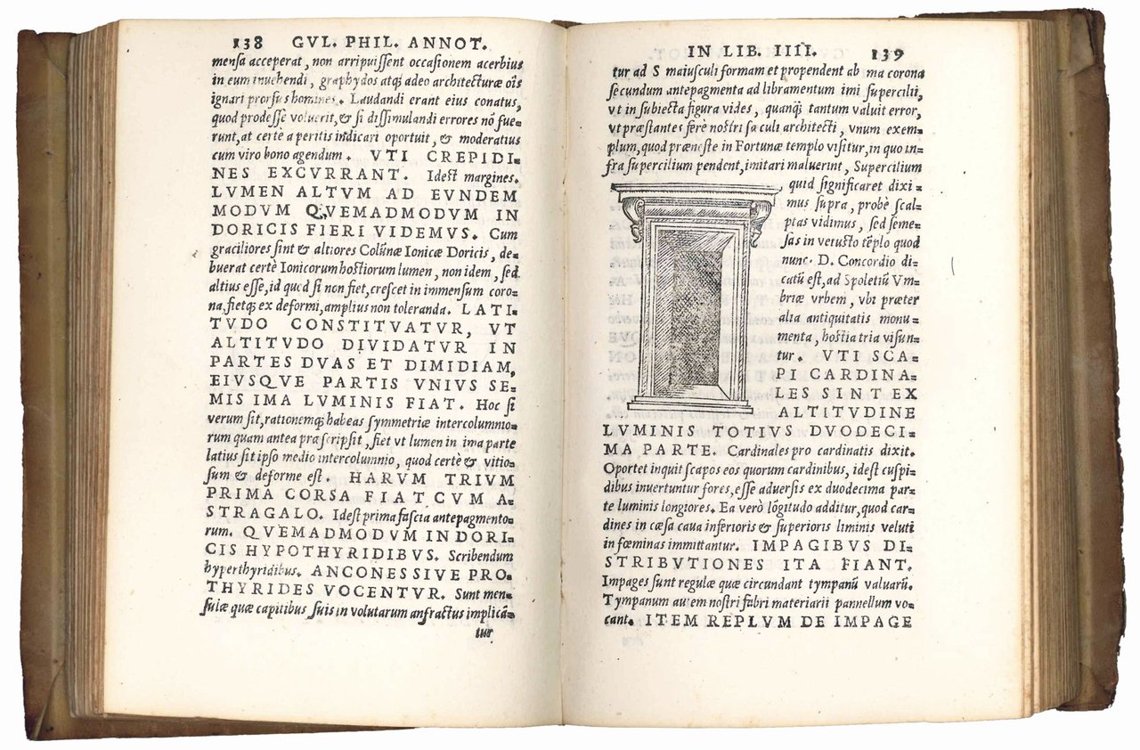 “Philander's commentary is composed of sections of the text followed by practical explanations and definitions, each passage heavily reinforced with scholarly and classical examples […] Philander's work is at once a learned study and a practical manual of architecture, incorporating the methods of both the humanists and architects […] It is the first synthesis of academic and practical interpretations of Vitruvius' treatise to appear in published form. The contribution of Philander and of the Accademia delle Virtù to mid-sixteenth-century architectural theory is of the greatest importance […] Philander's notes would be cited almost without exception by every Vitruvius commentator and translator, from the date of its first appearance until the nineteenth century” (D. Wiebenson, ed., The Mark J. Millard Architectural Collection, I: French books, New York, 1993, no. 165 for the 1552 edition).
