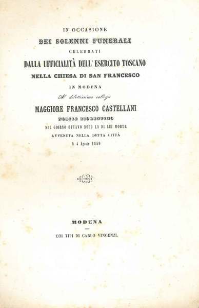 In occasione dei solenni funerali celebrati dalla ufficialità dell'esercito toscano nella chiesa di San Francesco in Modena al dilettissimo collega Maggiore Francesco Castellani nobile fiorentino nel giorno ottavo dopo la di lui morte avvenuta nella dett
