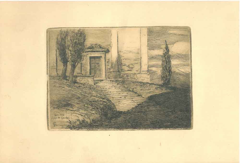 Incisione originale su rame dell'entrata della chiesa di Gaino sul lago di Garda