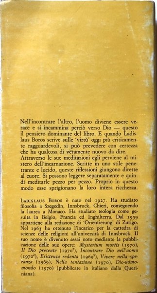Nelle sue profonde meditazioni sull'essenza di ciò che è umano, Boros perviene al mistero dell’incarnazione: il Dio che si fa totalmente, realmente uomo, il Dio che prende su di sé ciò che è terribilmente normale, abituale, che si lega a ciò che non dà nell'occhio. Perché proprio lì si produce l’originarietà dell’essenza umana. Riflessioni penetranti e lucide, che giungono dirette al cuore.