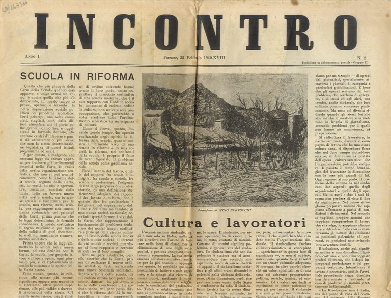 Firenze, Stab. Grafici di A. Vallecchi, 1940, fascicolo in-folio (in forma di giornale quotidiano), ripiegato, pp. 4. Il primo numero di "Incontro" vede la luce a Firenze il 10 febbraio 1940. La periodicità quindicinale viene mantenuta fino al settimo numero, pubblicato il 10 maggio 1940. I restanti sei numeri usciranno mensilmente, fino al tredicesimo numero (datato dicembre 1940) che segna la fine dell'avventura di questo periodico. La rivista inizia a pubblicare sei mesi dopo la chiusura definitiva di "Campo di Marte", l'altro quindicinale di azione letteraria e artistica, fondato da Alfonso Gatto e Vasco Pratolini. Quest'ultima rivista, divenuta l'organo ufficiale dell'ermetismo fiorentino, aveva raccolto, dall'agosto 1938 all'agosto 1939, un folto gruppo di scrittori, critici e poeti intenzionati a svolgere un'azione culturale autonoma rispetto al regime fascista, in un campo in cui la politica non poteva e non doveva interferire. Sulle pagine di "Incontro" scriveranno gli stessi collaboratori di "Campo di Marte" (da Pratolini a Gatto, a Bo, a Luzi a Betocchi), mantenendo la stessa autonomia e la stessa autorevolezza. Segnaliamo testi di Luigi Volpicelli, Gino Barbero, Alessandro Parronchi, una poesia di Carlo Betocchi, Vasco Pratolini, Carlo Bo, Berto Ricci. Un numero di questo quindicinale che uscì solo per un anno.