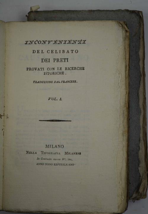 Due volumi di cm. 22, pp. 196; (4) 202 (4), Legatura strettamente coeva in cart. azzurro d'attesa. Esemplare genuino e marginoso, in barbe. Ben conservato. Cfr. Melzi (II, p. 28). Traduzione italiana dopo l'originale francese del 1781 di quest'opera polemica sull'impossibilità dei preti di sposarsi e le problematiche create in seguito a questa proibizione.
