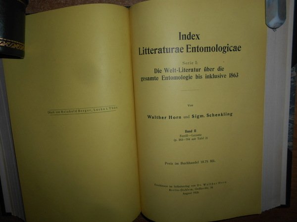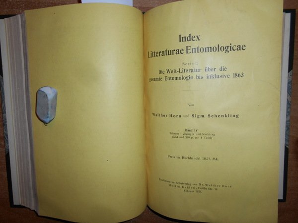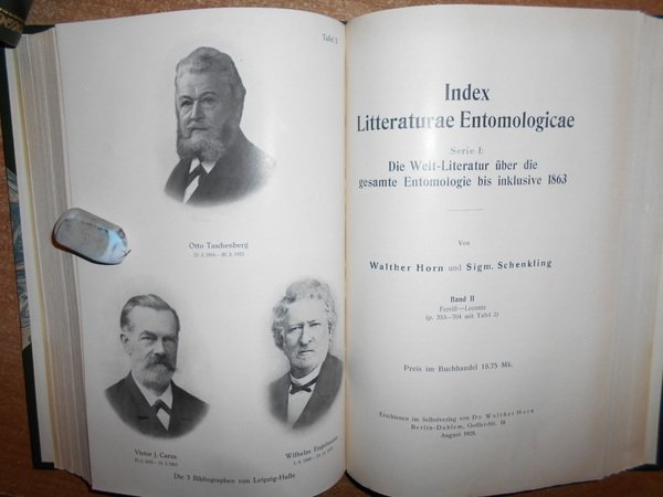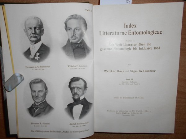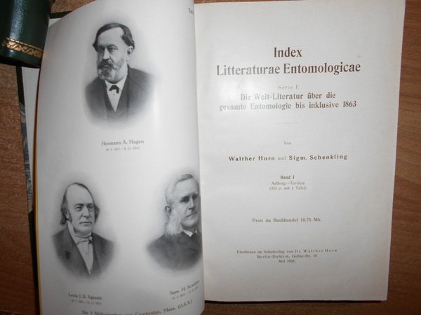 Von Walther Horn und Sigm. Schenkling. Berlin-Dahlem, Erschienen im Selbstverlag von Dr. Walther Horn, 1928 - 1929. INDEX Litteraturae Entomologicae. Die Welt-Literatur uber die gesamte Entomologie bis inklusive 1863. 4 volumi legati in 2 volumi in m. pelle con grandi angoli, dorsi a nervi con fregi e titoli in oro. Vol. I-II. Vol. III-IV., per complessive 1426 con alcuni ritratti f.t. Esemplari perfetti. Uff. D - I - 2