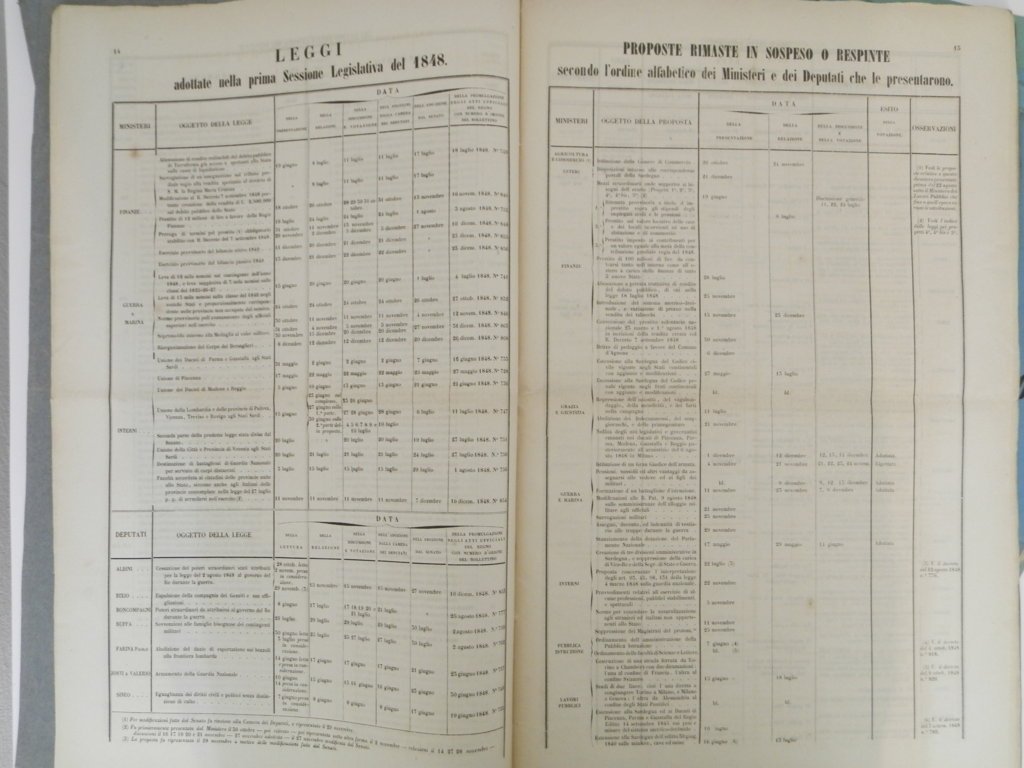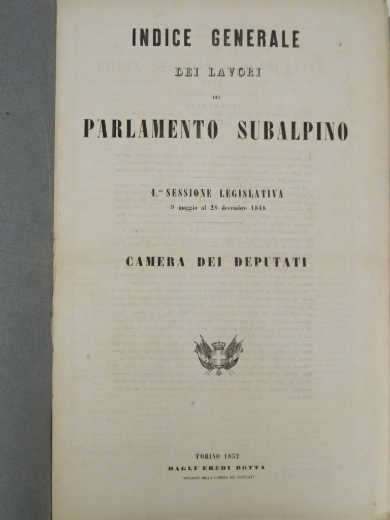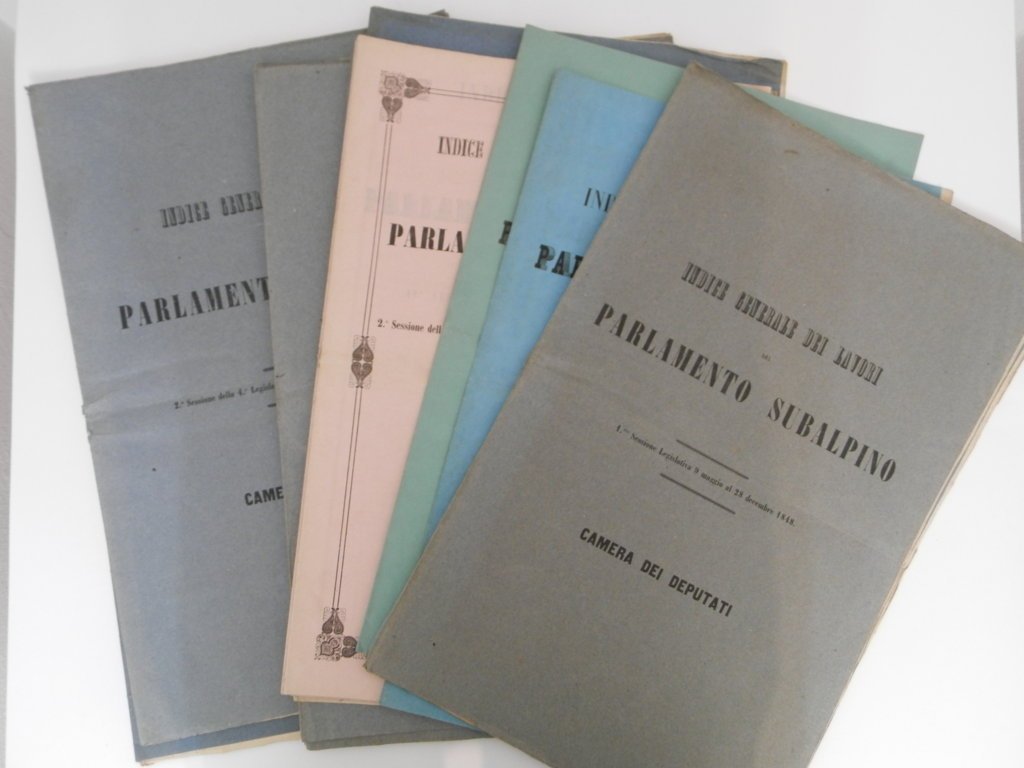 In folio, mm 470x310, nove fascicoli progressivi ognuno nella sua brossura editoriale a stampa perfettamente conservata e così composti: pp. 12; 8; 10; 15; 20; 24; 18; 18; 12. In aggiunta: 7 fascicoli ognuno nella sua brossura editoriale a stampa perfettamente conservata così composti: pp. 34; 24; 34; 46; 52; 40; 40. Il primo insieme di 9 fascicoli raccoglie senza interruzione i lavori della camera del Senato dalla I° alla V ° sessione legislativa, quindi dall'8 marzo 1848 al 16 luglio del 1857. Nel secondo insieme sono raccolti i lavori della Camera dei Deputati dalla I° alla V° sessione legislativa, ossia dal 9 maggio 1848 al 16 luglio 1857. Manca la sessione I° della V° legislazione tra il 1853 e il 1854. All'ultimo fascicolo mancanza all'angolo posteriore della brossura e dell'ultima pagina; per il resto 16 fascicoli in splendide condizioni e nell'insieme certamente ardui a reperirsi: un dettagliato sommario delle numerose attività del governo sabaudo nel periodo compreso tra le due guerre d'indipendenza.. *** TUTTI I NOSTRI LIBRI SONO VISIBILI PREVIO CONTATTO MAIL O TELEFONO NELLA NUOVA SEDE DI MILANO: LIBRERIA COSMOPOLIS, VIA JOMMELLI, 22. ***