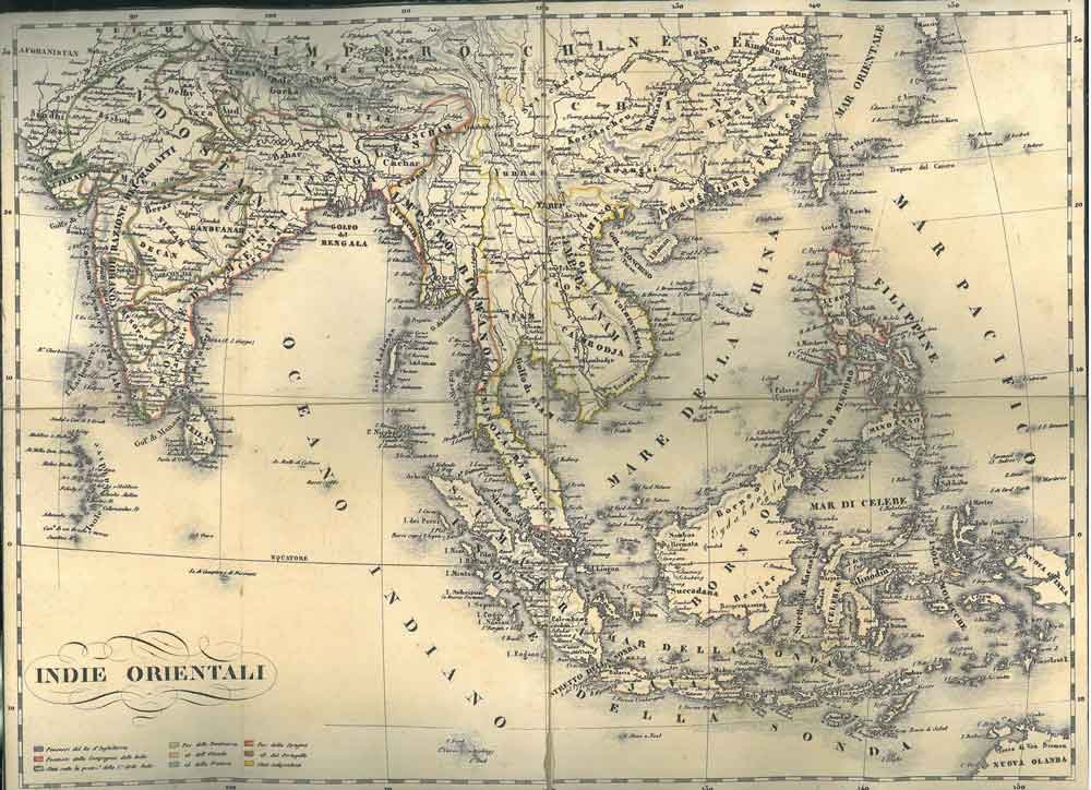 39x29 cm (aperta), carta geografica ottocentesca, ripiegata riportata su tela, titolo manoscritto su etichetta al retro; i confini sono segnati a colori a mano, a colori le indicazioni delle colonizzazioni;