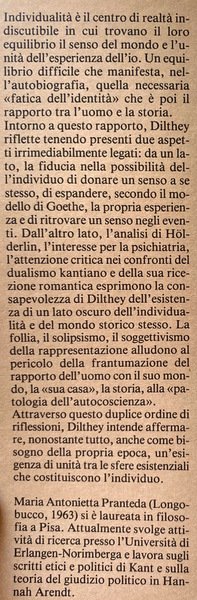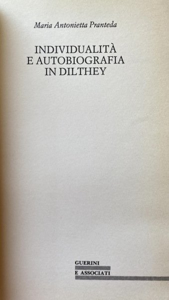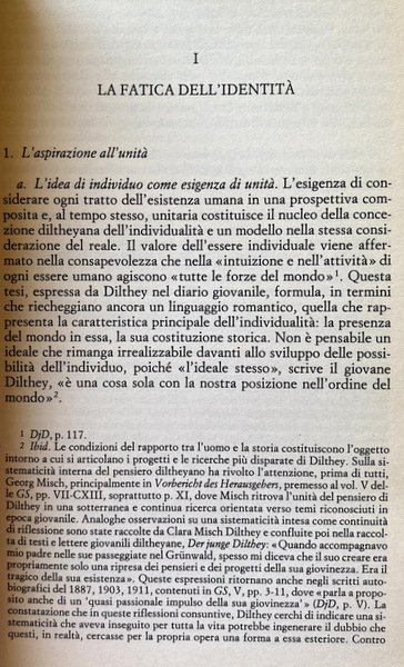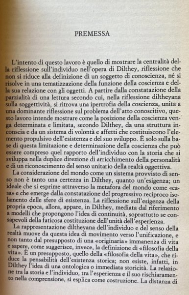 Soggetti: Filosofia tedesca, Individualità, Concetto, Wilhelm Dilthey, Filologia, Interpretazione, Pensiero filosofico, Identità, Autobiografia, Biografia, Storicità, Individuo, Esperienza, Erlebnis, Storicismo tedesco, Scienze umane, Geisteswissenschaften, Weltanschauungsphilosophie, Scienze dello spirito, Cultura, Comunità, Autonomia, Essenza, Bernard Groethuysen, Idealismo, Ermeneutica, Coscienza, Geschichte, Hermeneutik, Senso, Rapporto tra uomo e storia, Holderlin, Goethe, Psichiatria, Autocoscienza, Epoca, Destino, Tempo, Selbstbesinnung, Personalità, Universalità, Schleiermacher, Leibniz, Riedel, Ranke, Bianco, Descartes, Husserl, Humboldt, Heidegger, Habermas, Gadamer, Kant, Droysen, D'Ippolito, Cacciatore, Individualität, Verstehen, Comprensione, Erleben, Hölderlin, Poetica, Vita psichica, Libri Vintage Fuori catalogo, German Philosophy, Individuality, Concept, Philology, Interpretation, Philosophical Thought, Identity, Autobiography, Biography, Historicity, Individual, Experience, German Historicism, Human Sciences, Spiritual Sciences, Culture, Community, Autonomy, Essence, Idealism, Hermeneutics, Consciousness, Meaning, Relationship between man and history, Psychiatry, Self-awareness, Age, Destiny, Time, Personality, Universality, Understanding, Poetics, Psychic life, Books Out of print