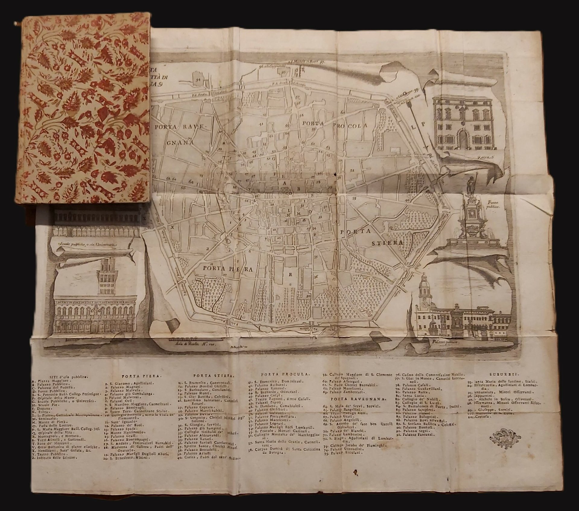 in-16, pp. 178, IV, leg. in bella carta dec. coeva con tass. e tit. oro al d. Con una gr. bella pianta della città con le sue antiche porte ripiegata la fine. Classica gida della città, impreziosita dalla mappa. Qualche pagina arrossata, bella copia. [518]