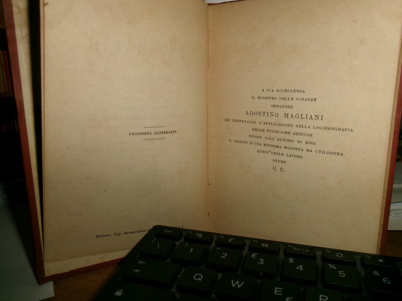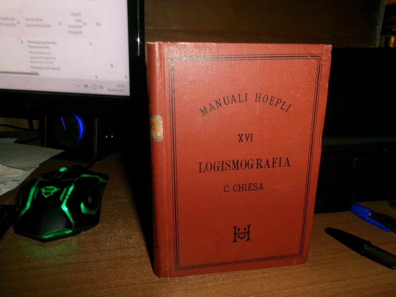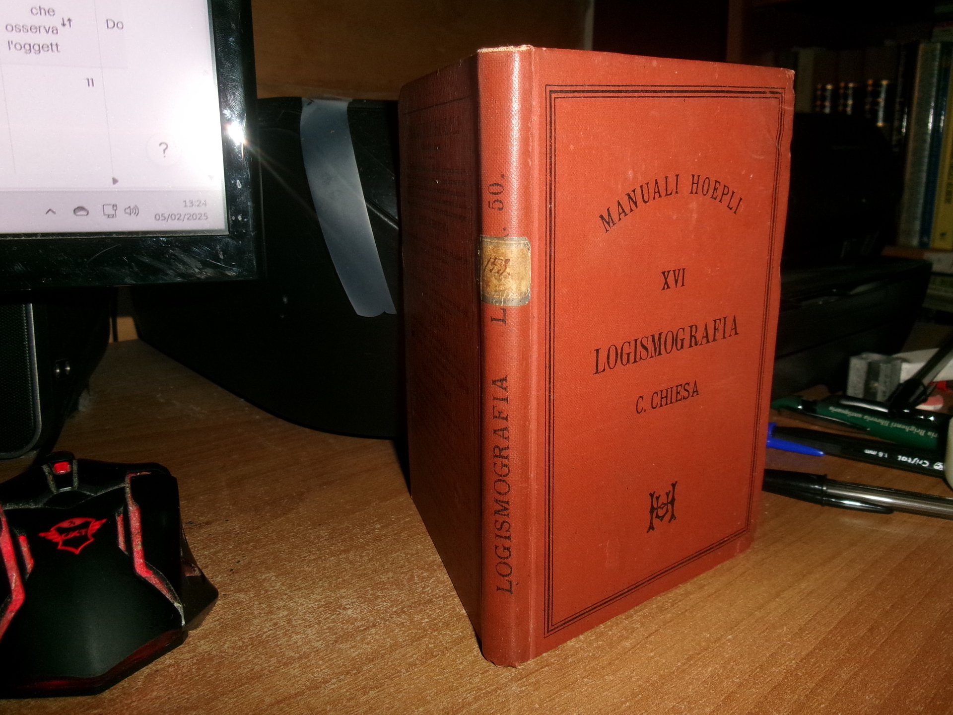 Ing. CELESTINO CHIESA. LOGISMOGRAFIA Teorica e Applicazioni. Milano, Ulrico Hoepli, 1888. In-16°, tela edit. xiv, 172 pp. + elenco completo dei Manuali Hoepli 8 pp. Ben conservato con firma nel frontespizio. Neg. Hoepli mob. 19