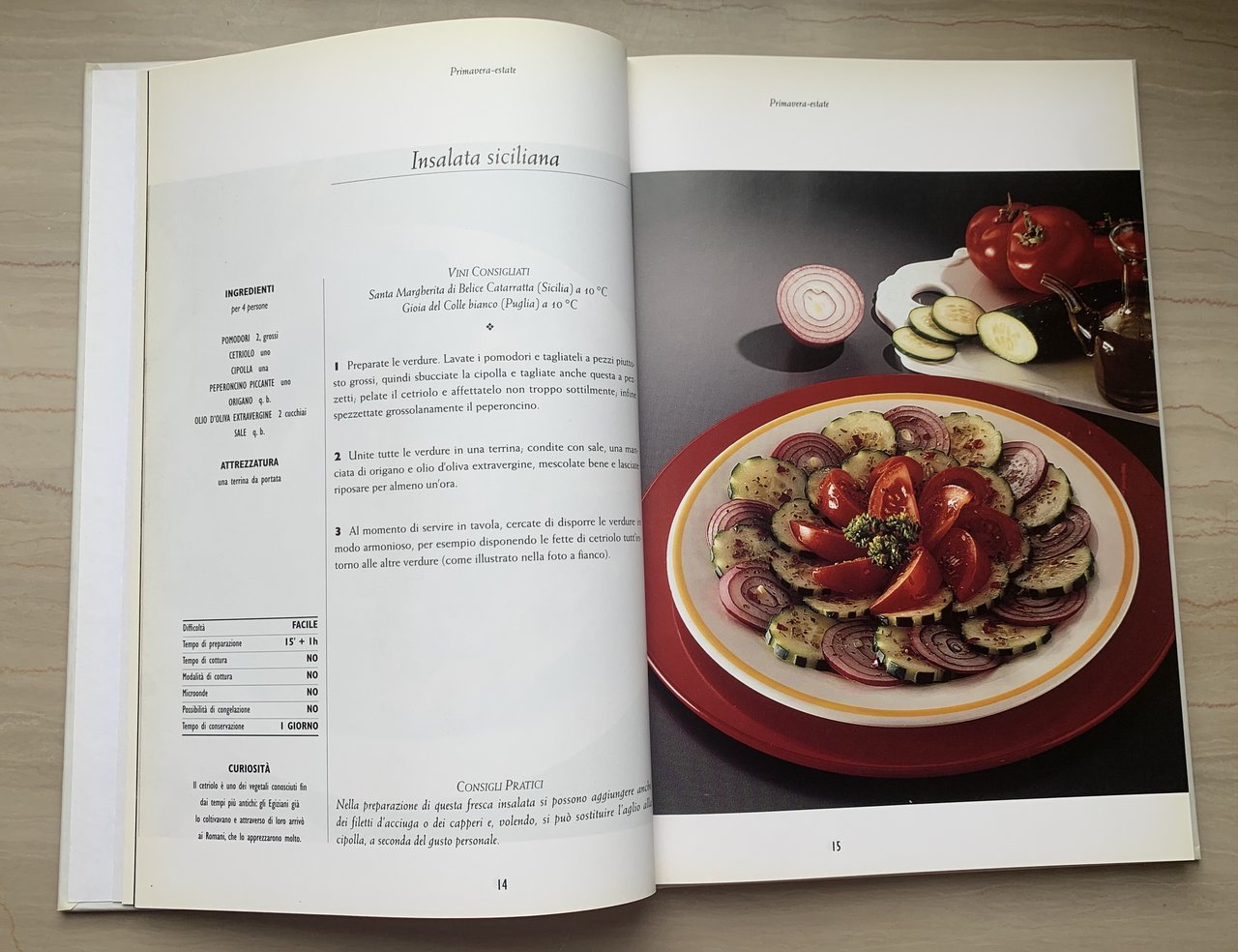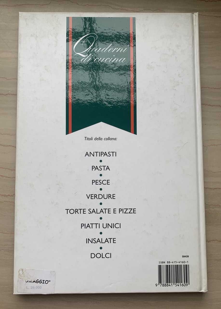 I ed.. Collana Quaderni di cucina 7. VIII grande/128/cart. (Legatura: Legatoria del Verbano). Illustrazioni fotografiche a colori f.t. e nel testo. Realizzazione: Miconi Arti Grafiche, Grugliasco (Torino). Stato buono (copertina polverosa - etichetta omaggio incollata sul prezzo in quarta di copertina parzialmente abrasa).