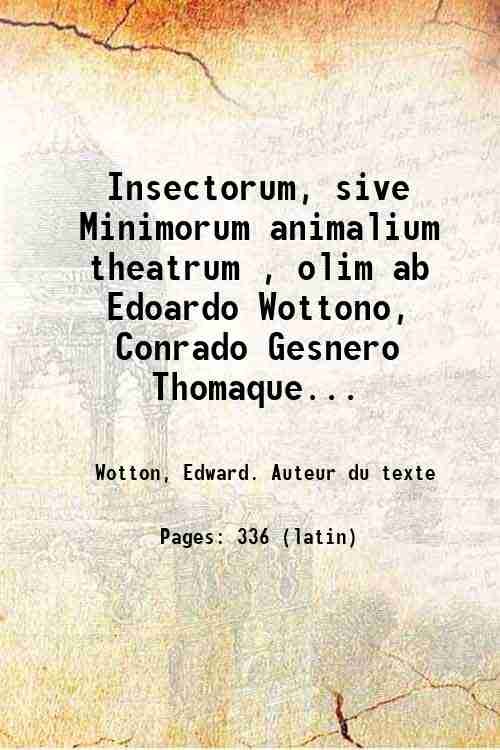 Insectorum, sive Minimorum animalium theatrum , olim ab Edoardo Wottono, Conrado Gesnero Thomaque Pennio inchoatum, tandem Tho. Moufeti,. opera sumptibusque maximis concinnatum, auctum, perfectum et ad vivum expressis iconibus supra quingentis illustratum 1634