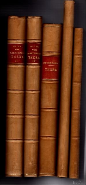 5 banden / volumes; . Die Insel Thera in Altertum und Gegenwart mit Ausschluss der Nekropolen. Unter Mitwirkung von W. Doerpfeld, D. Eginitis [et al. Band I. 404 pages. Mit 31 heliogravuren 240 Abbildungen in tekst und 12 Karten jund Ansichten in Mappe. Berlin, Georg Reimer, 1899. ************************************************** Theraeische Graeber Dragendorff, H. Thera. Untersuchungen, Vermessungen und Ausgrabungen in den jahren 1895 - 1902, Band 2 , 328 pages, Mith 5 tafeln und 521 Abbildungen in tekst. Berlin, Georg Reimer, 1903. ************************************************** BAND IV Wilski, P.: 1902. Klimatologische Beobachtungen aus Thera. 1 Teil. 53 PAG +BEILAGEN Klimatologische Beobachtungen aus Thera. 2 Teil. 202 PAG A- Meteorologische tabellen B- Nachtrage zu band I-III. + BAND THERA BILDER + BAND THERA KARTENMAPPE