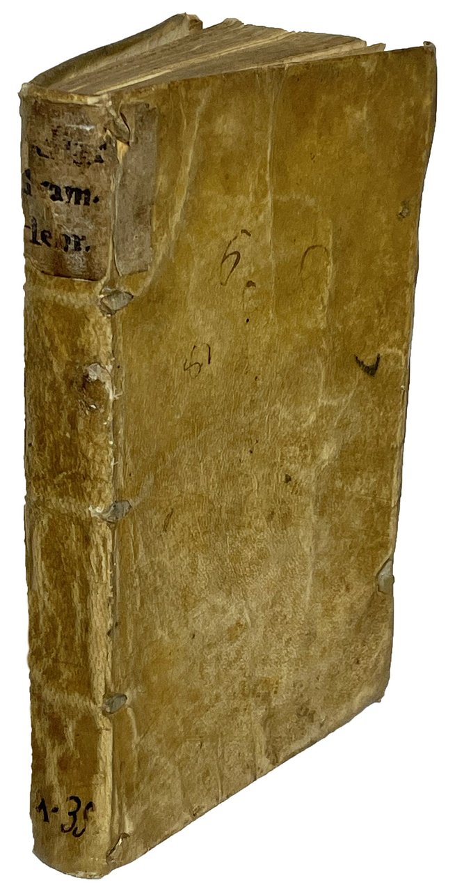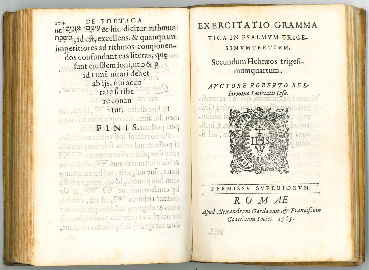 8vo (162x103 mm). 229, [3] pp. Collation: A-N8 O12. The Exercitatio grammatica in Psalmum XXXIII begins with a separate title page at l. L8. Roman, italic and Hebrew types. Woodcut emblem of the Society of Jesus on title pages and at the end. Contemporary limp vellum, ink title on spine (soiled, lacking ties). Some marginal foxing, but a good, genuine copy.