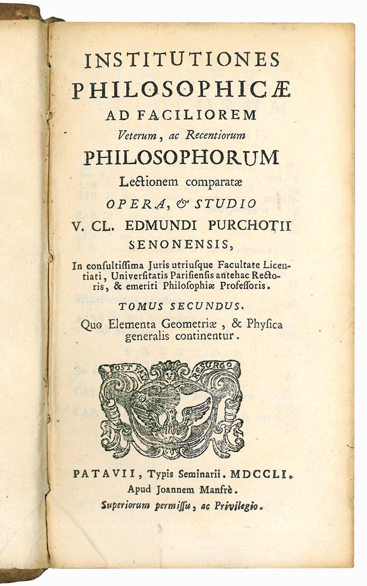 Institutiones philosophicae ad faciliorem veterum, ac recentiorum philosophorum lectionem comparatae opera, & studio V. CL. Edmundi Purchotii senonensis, in consultissima juris utriusque facultate licentiati, universitatis parisiensis antehac rectoris, & emeriti philosophiae professoris. Tomus secundus
