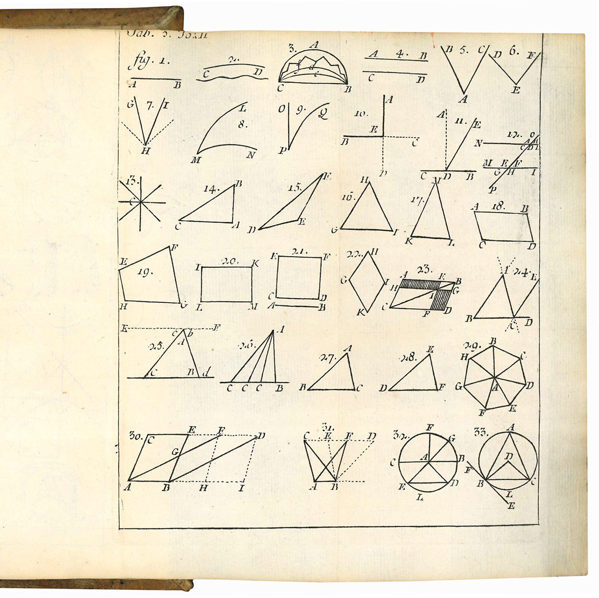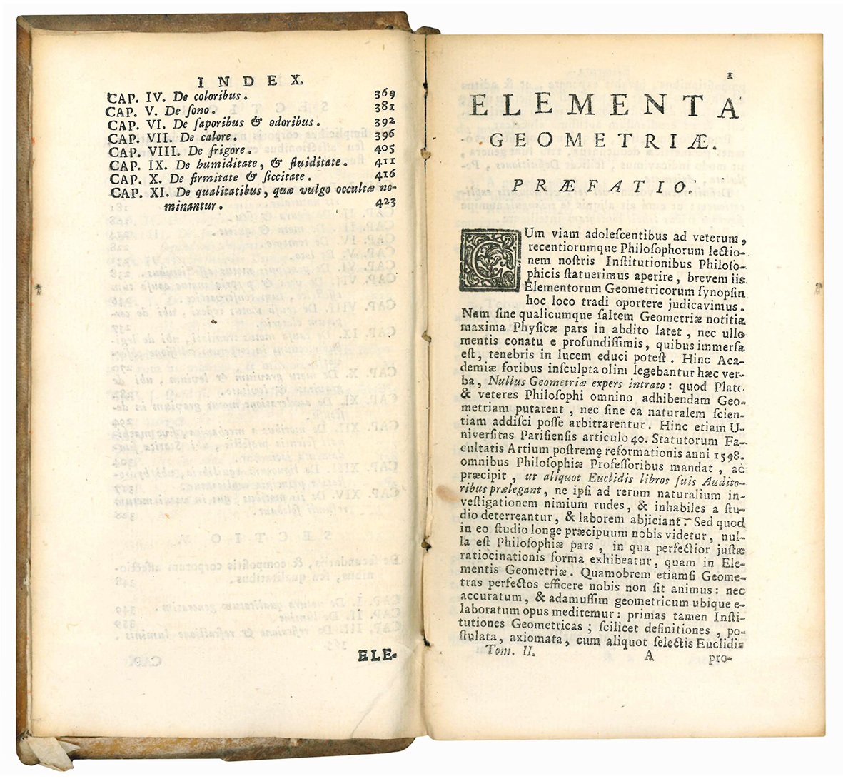 Un tomo di cinque in 12mo (mm), presente solamente il secondo tomo “Quo elementa geometriae, & physica generalis continentur”. Pp. [6], 428, III-XV tavv. fuori testo. Marca editoriale al frontespizio. Piena pergamena coeva con titolo manoscritto al dorso. Tagli spruzzati. Piatti e dorso un po' bruniti, alcune carte un po' sciolte.
