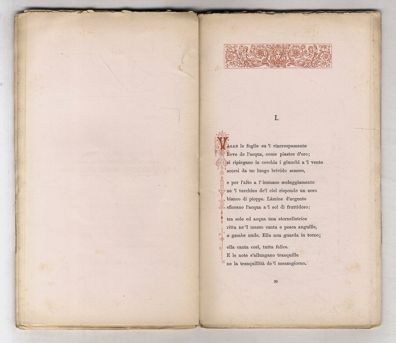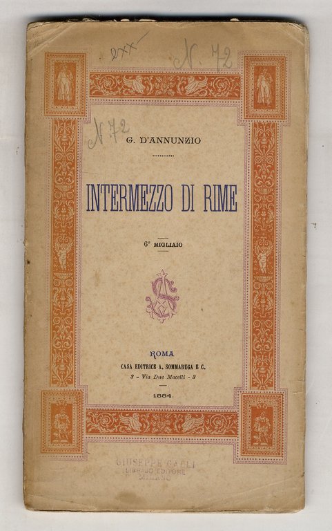 Roma, Casa Editrice A. Sommaruga e C., 1884, in-8, br. editoriale decorata (priva del dorso), pp. 68, [12]. Non numerate 2 pp. di indice e il catalogo editoriale Sommaruga. Prima edizione, sesto migliaio.