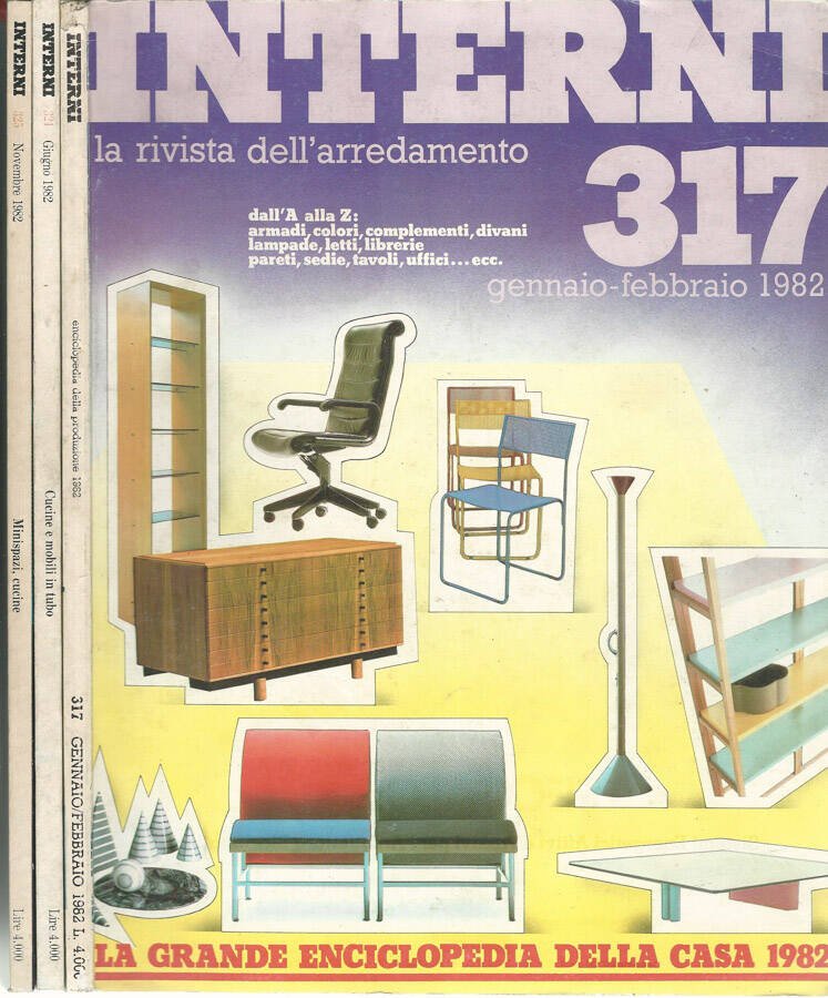 Annata incompleta composta da 3 uscite della rivista "Interni" anno 1982 n. 317, 321 e 325 rispettivamente dei mesi di gennaio-febbraio, aprile, giugno e novembre. Brossure illustrate ed ingiallite dal tempo presentanti segni di usura da scaffale ai margini e da sfregamento ai piatti con conseguenti macchioline di decolorazione e lievi abrasioni. Pagine godibili anche se leggermente ingiallite dal tempo; numerose illustrazioni a colori e pagine di pubblicità fuori testo. Piccolo segno a biro al piatto anteriore della coperta del numero 321. Circa 70 pagine per ogni uscita. Numero pagine complessive n.n.