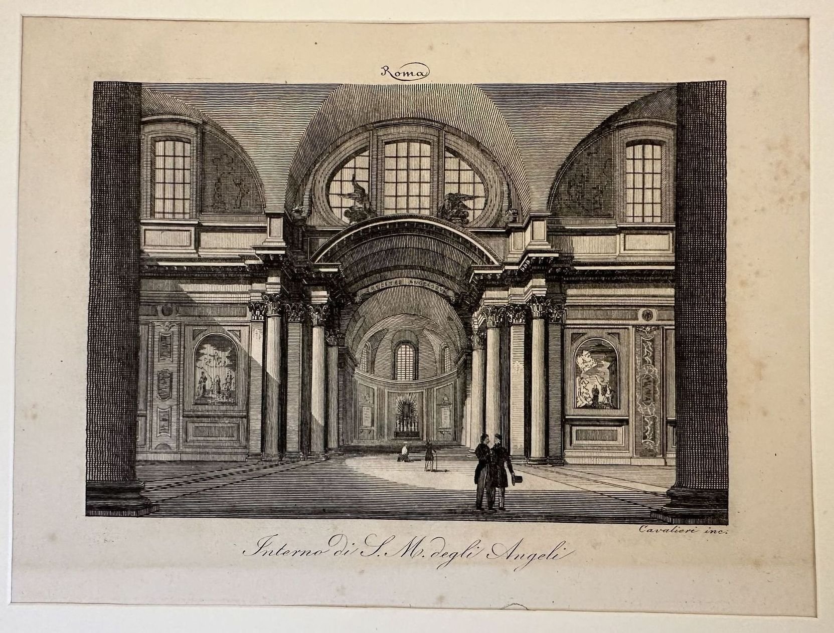Veduta animata della Chiesa di Santa Maria degli Angeli montata su un passepartout Autore: Cavalieri Data: 1840 circa Tecnica: Acquaforte Dimensione del passepartout: 32x27 cm Dimensione incisione: 20x15 cm Condizioni: Buone. Alcune fioriture.Lyhtographic view of the Church of Santa Maria degli Angeli mounted on a passepartout Author: Cavalieri Date: 1840 circa Technique: Etching Leaf Dimension: 32x27 cm Engraving Dimension: 20x15 cm Conditions: Good conditions. Some foxing.