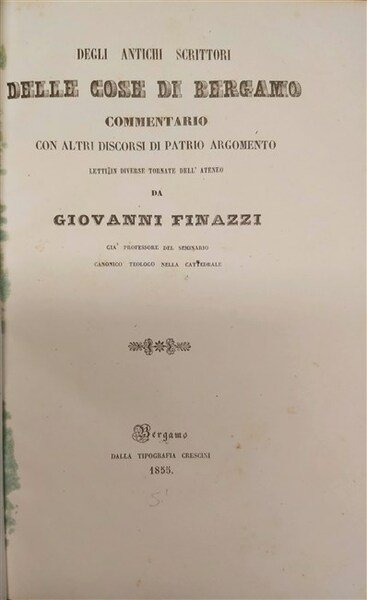 in-8, pp. 84, leg. mod. tela. Contiene notizie su 33 storici che hanno trattato cronache bergamasche: Tiraboschi, Cornazzani, Carrara, Bembrati, Terzi, Zanchi, Assonica, Beretta, Rapicio, Foresti etc. Raro. Lozzi 326. Bell’esempl. [283]
