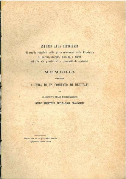 Intorno alla deficienza di strade roteabili nella parte montuosa delle provincie di Parma, Reggio, Modena e Massa ed alle vie provinciali e consortili da aprirvisi. Memoria pubblicata a cura di un comitato di deputati ed al seguito delle deliberazioni de
