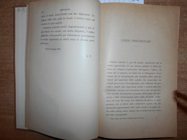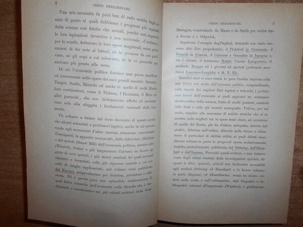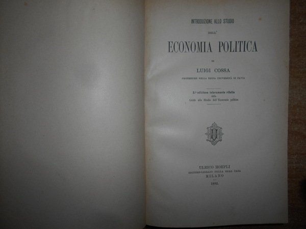 COSSA LUIGI. Milano, Ulrico Hoepli, 1892. INTRODUZIONE ALLO STUDIO DELL'ECONOMIA POLITICA. In-8° , tela con titolo in oro entro tassello al dorso. xii, 594 pp. Ottimo esemplare in legatura anni '70 con lievi sottolineature a matita in poche righe. Uff. B - III - 2
