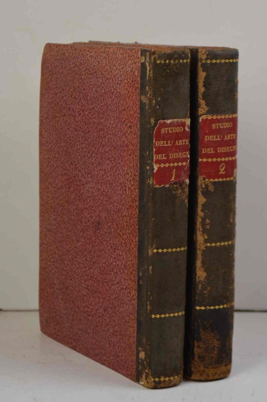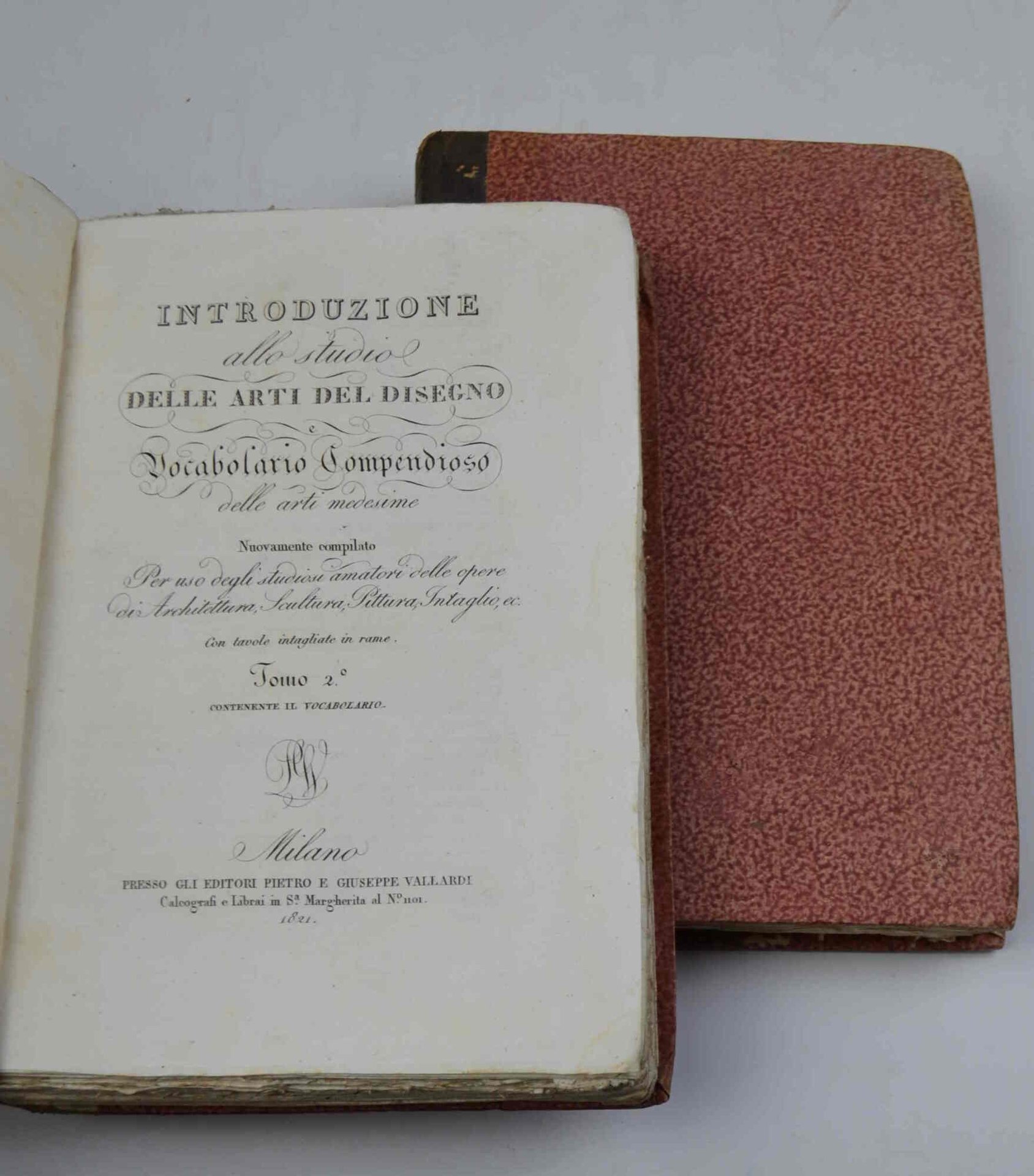 Due volumi di cm. 20,5, pp. viii, 304; xi (1) 426 (2). I frontespizi di entrambi i volumi risultano elegantemente incisi nella parte testuale. Il primo volume contiene 14 belle tavole fuori testo e comprende l'intera trattazione, il secondo è dedicato al Vocabolario compendioso. Solida legatura coeva in mezza pelle, dorsi lisci con fregi in oro e titoli su tasselli. Qualche spellatura superficiale ai doris, peraltro esemplare genuino e marginoso, ben conservato.